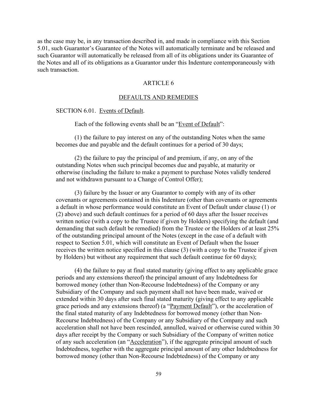 59 as the case may be, in any transaction described in, and made in compliance with this Section 5.01, such Guarantor’s Guarantee of the Notes will automatically terminate and be released and such Guarantor will automatically be released from all of its obligations under its Guarantee of the Notes and all of its obligations as a Guarantor under this Indenture contemporaneously with such transaction. ARTICLE 6 DEFAULTS AND REMEDIES SECTION 6.01. Events of Default. Each of the following events shall be an “Event of Default”: (1) the failure to pay interest on any of the outstanding Notes when the same becomes due and payable and the default continues for a period of 30 days; (2) the failure to pay the principal of and premium, if any, on any of the outstanding Notes when such principal becomes due and payable, at maturity or otherwise (including the failure to make a payment to purchase Notes validly tendered and not withdrawn pursuant to a Change of Control Offer); (3) failure by the Issuer or any Guarantor to comply with any of its other covenants or agreements contained in this Indenture (other than covenants or agreements a default in whose performance would constitute an Event of Default under clause (1) or (2) above) and such default continues for a period of 60 days after the Issuer receives written notice (with a copy to the Trustee if given by Holders) specifying the default (and demanding that such default be remedied) from the Trustee or the Holders of at least 25% of the outstanding principal amount of the Notes (except in the case of a default with respect to Section 5.01, which will constitute an Event of Default when the Issuer receives the written notice specified in this clause (3) (with a copy to the Trustee if given by Holders) but without any requirement that such default continue for 60 days); (4) the failure to pay at final stated maturity (giving effect to any applicable grace periods and any extensions thereof) the principal amount of any Indebtedness for borrowed money (other than Non-Recourse Indebtedness) of the Company or any Subsidiary of the Company and such payment shall not have been made, waived or extended within 30 days after such final stated maturity (giving effect to any applicable grace periods and any extensions thereof) (a “Payment Default”), or the acceleration of the final stated maturity of any Indebtedness for borrowed money (other than Non- Recourse Indebtedness) of the Company or any Subsidiary of the Company and such acceleration shall not have been rescinded, annulled, waived or otherwise cured within 30 days after receipt by the Company or such Subsidiary of the Company of written notice of any such acceleration (an “Acceleration”), if the aggregate principal amount of such Indebtedness, together with the aggregate principal amount of any other Indebtedness for borrowed money (other than Non-Recourse Indebtedness) of the Company or any