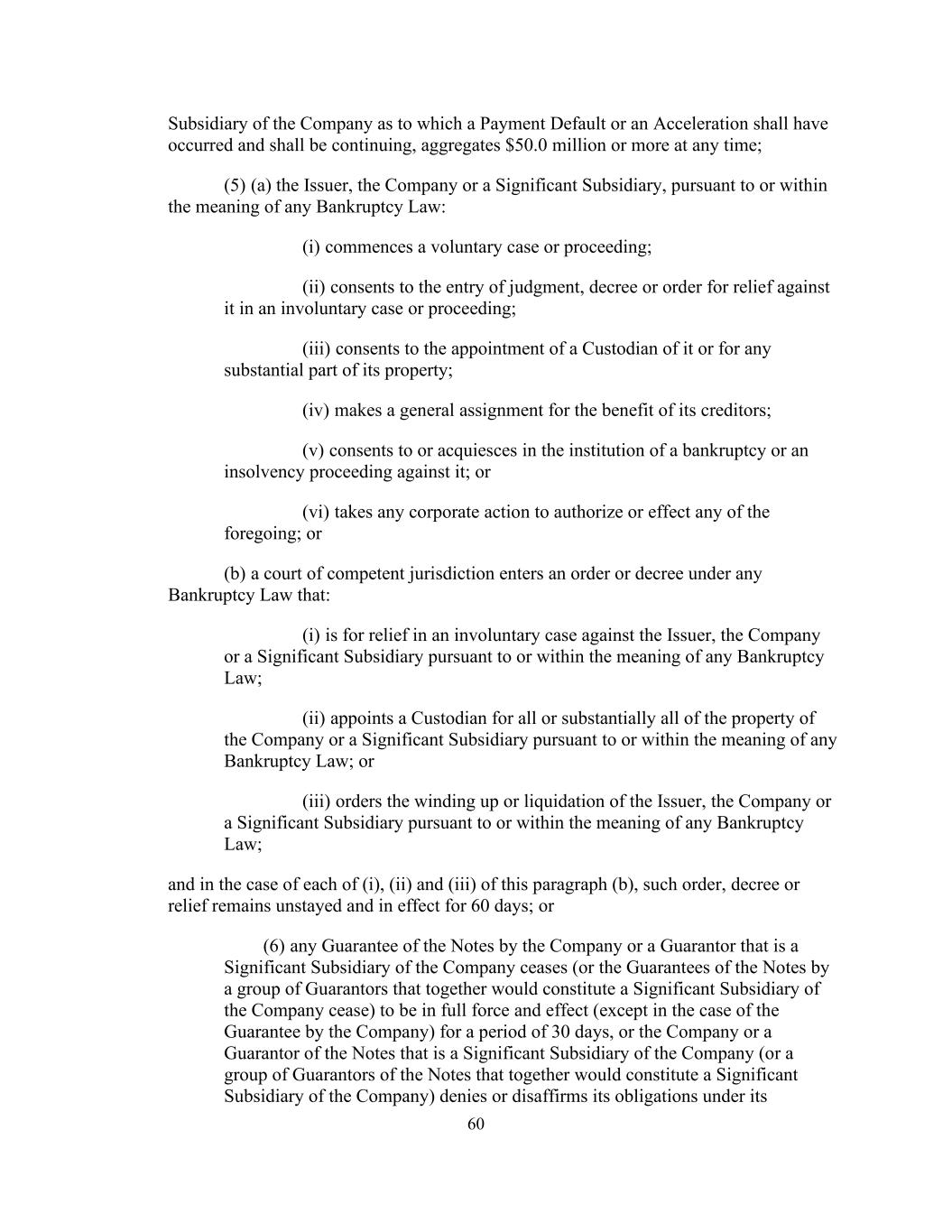 60 Subsidiary of the Company as to which a Payment Default or an Acceleration shall have occurred and shall be continuing, aggregates $50.0 million or more at any time; (5) (a) the Issuer, the Company or a Significant Subsidiary, pursuant to or within the meaning of any Bankruptcy Law: (i) commences a voluntary case or proceeding; (ii) consents to the entry of judgment, decree or order for relief against it in an involuntary case or proceeding; (iii) consents to the appointment of a Custodian of it or for any substantial part of its property; (iv) makes a general assignment for the benefit of its creditors; (v) consents to or acquiesces in the institution of a bankruptcy or an insolvency proceeding against it; or (vi) takes any corporate action to authorize or effect any of the foregoing; or (b) a court of competent jurisdiction enters an order or decree under any Bankruptcy Law that: (i) is for relief in an involuntary case against the Issuer, the Company or a Significant Subsidiary pursuant to or within the meaning of any Bankruptcy Law; (ii) appoints a Custodian for all or substantially all of the property of the Company or a Significant Subsidiary pursuant to or within the meaning of any Bankruptcy Law; or (iii) orders the winding up or liquidation of the Issuer, the Company or a Significant Subsidiary pursuant to or within the meaning of any Bankruptcy Law; and in the case of each of (i), (ii) and (iii) of this paragraph (b), such order, decree or relief remains unstayed and in effect for 60 days; or (6) any Guarantee of the Notes by the Company or a Guarantor that is a Significant Subsidiary of the Company ceases (or the Guarantees of the Notes by a group of Guarantors that together would constitute a Significant Subsidiary of the Company cease) to be in full force and effect (except in the case of the Guarantee by the Company) for a period of 30 days, or the Company or a Guarantor of the Notes that is a Significant Subsidiary of the Company (or a group of Guarantors of the Notes that together would constitute a Significant Subsidiary of the Company) denies or disaffirms its obligations under its