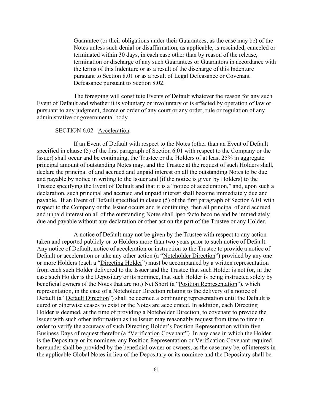 61 Guarantee (or their obligations under their Guarantees, as the case may be) of the Notes unless such denial or disaffirmation, as applicable, is rescinded, canceled or terminated within 30 days, in each case other than by reason of the release, termination or discharge of any such Guarantees or Guarantors in accordance with the terms of this Indenture or as a result of the discharge of this Indenture pursuant to Section 8.01 or as a result of Legal Defeasance or Covenant Defeasance pursuant to Section 8.02. The foregoing will constitute Events of Default whatever the reason for any such Event of Default and whether it is voluntary or involuntary or is effected by operation of law or pursuant to any judgment, decree or order of any court or any order, rule or regulation of any administrative or governmental body. SECTION 6.02. Acceleration. If an Event of Default with respect to the Notes (other than an Event of Default specified in clause (5) of the first paragraph of Section 6.01 with respect to the Company or the Issuer) shall occur and be continuing, the Trustee or the Holders of at least 25% in aggregate principal amount of outstanding Notes may, and the Trustee at the request of such Holders shall, declare the principal of and accrued and unpaid interest on all the outstanding Notes to be due and payable by notice in writing to the Issuer and (if the notice is given by Holders) to the Trustee specifying the Event of Default and that it is a “notice of acceleration,” and, upon such a declaration, such principal and accrued and unpaid interest shall become immediately due and payable. If an Event of Default specified in clause (5) of the first paragraph of Section 6.01 with respect to the Company or the Issuer occurs and is continuing, then all principal of and accrued and unpaid interest on all of the outstanding Notes shall ipso facto become and be immediately due and payable without any declaration or other act on the part of the Trustee or any Holder. A notice of Default may not be given by the Trustee with respect to any action taken and reported publicly or to Holders more than two years prior to such notice of Default. Any notice of Default, notice of acceleration or instruction to the Trustee to provide a notice of Default or acceleration or take any other action (a “Noteholder Direction”) provided by any one or more Holders (each a “Directing Holder”) must be accompanied by a written representation from each such Holder delivered to the Issuer and the Trustee that such Holder is not (or, in the case such Holder is the Depositary or its nominee, that such Holder is being instructed solely by beneficial owners of the Notes that are not) Net Short (a “Position Representation”), which representation, in the case of a Noteholder Direction relating to the delivery of a notice of Default (a “Default Direction”) shall be deemed a continuing representation until the Default is cured or otherwise ceases to exist or the Notes are accelerated. In addition, each Directing Holder is deemed, at the time of providing a Noteholder Direction, to covenant to provide the Issuer with such other information as the Issuer may reasonably request from time to time in order to verify the accuracy of such Directing Holder’s Position Representation within five Business Days of request therefor (a “Verification Covenant”). In any case in which the Holder is the Depositary or its nominee, any Position Representation or Verification Covenant required hereunder shall be provided by the beneficial owner or owners, as the case may be, of interests in the applicable Global Notes in lieu of the Depositary or its nominee and the Depositary shall be