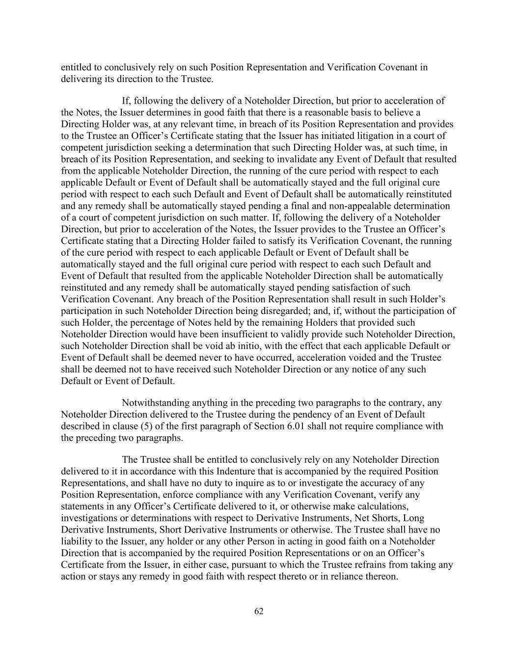 62 entitled to conclusively rely on such Position Representation and Verification Covenant in delivering its direction to the Trustee. If, following the delivery of a Noteholder Direction, but prior to acceleration of the Notes, the Issuer determines in good faith that there is a reasonable basis to believe a Directing Holder was, at any relevant time, in breach of its Position Representation and provides to the Trustee an Officer’s Certificate stating that the Issuer has initiated litigation in a court of competent jurisdiction seeking a determination that such Directing Holder was, at such time, in breach of its Position Representation, and seeking to invalidate any Event of Default that resulted from the applicable Noteholder Direction, the running of the cure period with respect to each applicable Default or Event of Default shall be automatically stayed and the full original cure period with respect to each such Default and Event of Default shall be automatically reinstituted and any remedy shall be automatically stayed pending a final and non-appealable determination of a court of competent jurisdiction on such matter. If, following the delivery of a Noteholder Direction, but prior to acceleration of the Notes, the Issuer provides to the Trustee an Officer’s Certificate stating that a Directing Holder failed to satisfy its Verification Covenant, the running of the cure period with respect to each applicable Default or Event of Default shall be automatically stayed and the full original cure period with respect to each such Default and Event of Default that resulted from the applicable Noteholder Direction shall be automatically reinstituted and any remedy shall be automatically stayed pending satisfaction of such Verification Covenant. Any breach of the Position Representation shall result in such Holder’s participation in such Noteholder Direction being disregarded; and, if, without the participation of such Holder, the percentage of Notes held by the remaining Holders that provided such Noteholder Direction would have been insufficient to validly provide such Noteholder Direction, such Noteholder Direction shall be void ab initio, with the effect that each applicable Default or Event of Default shall be deemed never to have occurred, acceleration voided and the Trustee shall be deemed not to have received such Noteholder Direction or any notice of any such Default or Event of Default. Notwithstanding anything in the preceding two paragraphs to the contrary, any Noteholder Direction delivered to the Trustee during the pendency of an Event of Default described in clause (5) of the first paragraph of Section 6.01 shall not require compliance with the preceding two paragraphs. The Trustee shall be entitled to conclusively rely on any Noteholder Direction delivered to it in accordance with this Indenture that is accompanied by the required Position Representations, and shall have no duty to inquire as to or investigate the accuracy of any Position Representation, enforce compliance with any Verification Covenant, verify any statements in any Officer’s Certificate delivered to it, or otherwise make calculations, investigations or determinations with respect to Derivative Instruments, Net Shorts, Long Derivative Instruments, Short Derivative Instruments or otherwise. The Trustee shall have no liability to the Issuer, any holder or any other Person in acting in good faith on a Noteholder Direction that is accompanied by the required Position Representations or on an Officer’s Certificate from the Issuer, in either case, pursuant to which the Trustee refrains from taking any action or stays any remedy in good faith with respect thereto or in reliance thereon.