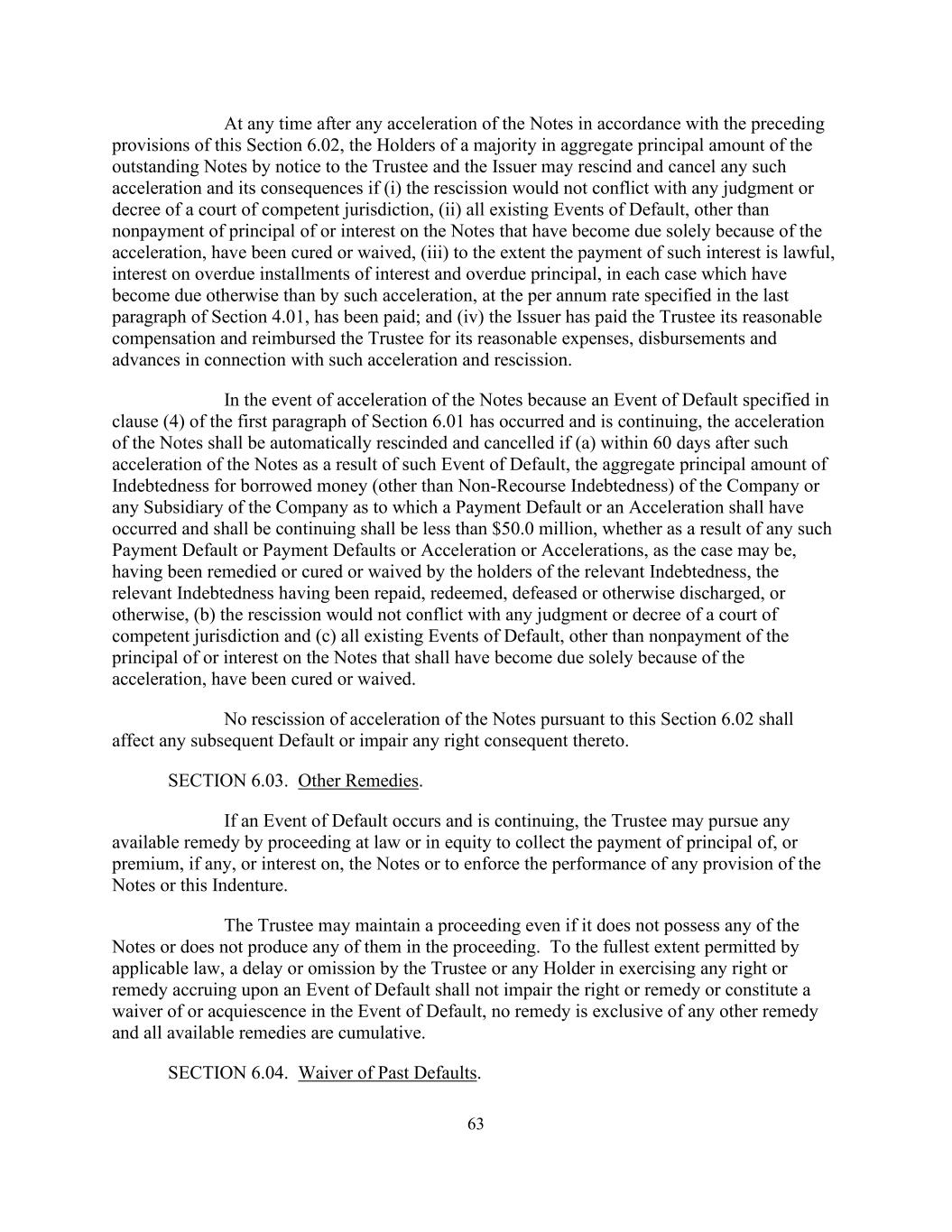 63 At any time after any acceleration of the Notes in accordance with the preceding provisions of this Section 6.02, the Holders of a majority in aggregate principal amount of the outstanding Notes by notice to the Trustee and the Issuer may rescind and cancel any such acceleration and its consequences if (i) the rescission would not conflict with any judgment or decree of a court of competent jurisdiction, (ii) all existing Events of Default, other than nonpayment of principal of or interest on the Notes that have become due solely because of the acceleration, have been cured or waived, (iii) to the extent the payment of such interest is lawful, interest on overdue installments of interest and overdue principal, in each case which have become due otherwise than by such acceleration, at the per annum rate specified in the last paragraph of Section 4.01, has been paid; and (iv) the Issuer has paid the Trustee its reasonable compensation and reimbursed the Trustee for its reasonable expenses, disbursements and advances in connection with such acceleration and rescission. In the event of acceleration of the Notes because an Event of Default specified in clause (4) of the first paragraph of Section 6.01 has occurred and is continuing, the acceleration of the Notes shall be automatically rescinded and cancelled if (a) within 60 days after such acceleration of the Notes as a result of such Event of Default, the aggregate principal amount of Indebtedness for borrowed money (other than Non-Recourse Indebtedness) of the Company or any Subsidiary of the Company as to which a Payment Default or an Acceleration shall have occurred and shall be continuing shall be less than $50.0 million, whether as a result of any such Payment Default or Payment Defaults or Acceleration or Accelerations, as the case may be, having been remedied or cured or waived by the holders of the relevant Indebtedness, the relevant Indebtedness having been repaid, redeemed, defeased or otherwise discharged, or otherwise, (b) the rescission would not conflict with any judgment or decree of a court of competent jurisdiction and (c) all existing Events of Default, other than nonpayment of the principal of or interest on the Notes that shall have become due solely because of the acceleration, have been cured or waived. No rescission of acceleration of the Notes pursuant to this Section 6.02 shall affect any subsequent Default or impair any right consequent thereto. SECTION 6.03. Other Remedies. If an Event of Default occurs and is continuing, the Trustee may pursue any available remedy by proceeding at law or in equity to collect the payment of principal of, or premium, if any, or interest on, the Notes or to enforce the performance of any provision of the Notes or this Indenture. The Trustee may maintain a proceeding even if it does not possess any of the Notes or does not produce any of them in the proceeding. To the fullest extent permitted by applicable law, a delay or omission by the Trustee or any Holder in exercising any right or remedy accruing upon an Event of Default shall not impair the right or remedy or constitute a waiver of or acquiescence in the Event of Default, no remedy is exclusive of any other remedy and all available remedies are cumulative. SECTION 6.04. Waiver of Past Defaults.