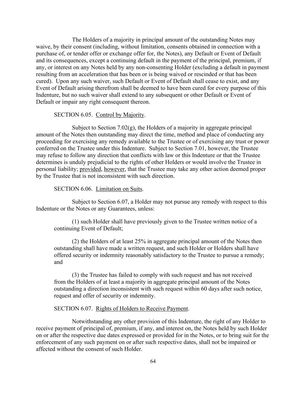64 The Holders of a majority in principal amount of the outstanding Notes may waive, by their consent (including, without limitation, consents obtained in connection with a purchase of, or tender offer or exchange offer for, the Notes), any Default or Event of Default and its consequences, except a continuing default in the payment of the principal, premium, if any, or interest on any Notes held by any non-consenting Holder (excluding a default in payment resulting from an acceleration that has been or is being waived or rescinded or that has been cured). Upon any such waiver, such Default or Event of Default shall cease to exist, and any Event of Default arising therefrom shall be deemed to have been cured for every purpose of this Indenture, but no such waiver shall extend to any subsequent or other Default or Event of Default or impair any right consequent thereon. SECTION 6.05. Control by Majority. Subject to Section 7.02(g), the Holders of a majority in aggregate principal amount of the Notes then outstanding may direct the time, method and place of conducting any proceeding for exercising any remedy available to the Trustee or of exercising any trust or power conferred on the Trustee under this Indenture. Subject to Section 7.01, however, the Trustee may refuse to follow any direction that conflicts with law or this Indenture or that the Trustee determines is unduly prejudicial to the rights of other Holders or would involve the Trustee in personal liability; provided, however, that the Trustee may take any other action deemed proper by the Trustee that is not inconsistent with such direction. SECTION 6.06. Limitation on Suits. Subject to Section 6.07, a Holder may not pursue any remedy with respect to this Indenture or the Notes or any Guarantees, unless: (1) such Holder shall have previously given to the Trustee written notice of a continuing Event of Default; (2) the Holders of at least 25% in aggregate principal amount of the Notes then outstanding shall have made a written request, and such Holder or Holders shall have offered security or indemnity reasonably satisfactory to the Trustee to pursue a remedy; and (3) the Trustee has failed to comply with such request and has not received from the Holders of at least a majority in aggregate principal amount of the Notes outstanding a direction inconsistent with such request within 60 days after such notice, request and offer of security or indemnity. SECTION 6.07. Rights of Holders to Receive Payment. Notwithstanding any other provision of this Indenture, the right of any Holder to receive payment of principal of, premium, if any, and interest on, the Notes held by such Holder on or after the respective due dates expressed or provided for in the Notes, or to bring suit for the enforcement of any such payment on or after such respective dates, shall not be impaired or affected without the consent of such Holder.