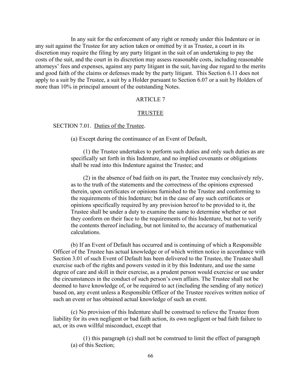 66 In any suit for the enforcement of any right or remedy under this Indenture or in any suit against the Trustee for any action taken or omitted by it as Trustee, a court in its discretion may require the filing by any party litigant in the suit of an undertaking to pay the costs of the suit, and the court in its discretion may assess reasonable costs, including reasonable attorneys’ fees and expenses, against any party litigant in the suit, having due regard to the merits and good faith of the claims or defenses made by the party litigant. This Section 6.11 does not apply to a suit by the Trustee, a suit by a Holder pursuant to Section 6.07 or a suit by Holders of more than 10% in principal amount of the outstanding Notes. ARTICLE 7 TRUSTEE SECTION 7.01. Duties of the Trustee. (a) Except during the continuance of an Event of Default, (1) the Trustee undertakes to perform such duties and only such duties as are specifically set forth in this Indenture, and no implied covenants or obligations shall be read into this Indenture against the Trustee; and (2) in the absence of bad faith on its part, the Trustee may conclusively rely, as to the truth of the statements and the correctness of the opinions expressed therein, upon certificates or opinions furnished to the Trustee and conforming to the requirements of this Indenture; but in the case of any such certificates or opinions specifically required by any provision hereof to be provided to it, the Trustee shall be under a duty to examine the same to determine whether or not they conform on their face to the requirements of this Indenture, but not to verify the contents thereof including, but not limited to, the accuracy of mathematical calculations. (b) If an Event of Default has occurred and is continuing of which a Responsible Officer of the Trustee has actual knowledge or of which written notice in accordance with Section 3.01 of such Event of Default has been delivered to the Trustee, the Trustee shall exercise such of the rights and powers vested in it by this Indenture, and use the same degree of care and skill in their exercise, as a prudent person would exercise or use under the circumstances in the conduct of such person’s own affairs. The Trustee shall not be deemed to have knowledge of, or be required to act (including the sending of any notice) based on, any event unless a Responsible Officer of the Trustee receives written notice of such an event or has obtained actual knowledge of such an event. (c) No provision of this Indenture shall be construed to relieve the Trustee from liability for its own negligent or bad faith action, its own negligent or bad faith failure to act, or its own willful misconduct, except that (1) this paragraph (c) shall not be construed to limit the effect of paragraph (a) of this Section;