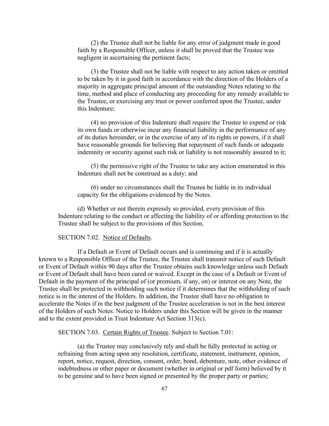 67 (2) the Trustee shall not be liable for any error of judgment made in good faith by a Responsible Officer, unless it shall be proved that the Trustee was negligent in ascertaining the pertinent facts; (3) the Trustee shall not be liable with respect to any action taken or omitted to be taken by it in good faith in accordance with the direction of the Holders of a majority in aggregate principal amount of the outstanding Notes relating to the time, method and place of conducting any proceeding for any remedy available to the Trustee, or exercising any trust or power conferred upon the Trustee, under this Indenture; (4) no provision of this Indenture shall require the Trustee to expend or risk its own funds or otherwise incur any financial liability in the performance of any of its duties hereunder, or in the exercise of any of its rights or powers, if it shall have reasonable grounds for believing that repayment of such funds or adequate indemnity or security against such risk or liability is not reasonably assured to it; (5) the permissive right of the Trustee to take any action enumerated in this Indenture shall not be construed as a duty; and (6) under no circumstances shall the Trustee be liable in its individual capacity for the obligations evidenced by the Notes. (d) Whether or not therein expressly so provided, every provision of this Indenture relating to the conduct or affecting the liability of or affording protection to the Trustee shall be subject to the provisions of this Section. SECTION 7.02. Notice of Defaults. If a Default or Event of Default occurs and is continuing and if it is actually known to a Responsible Officer of the Trustee, the Trustee shall transmit notice of such Default or Event of Default within 90 days after the Trustee obtains such knowledge unless such Default or Event of Default shall have been cured or waived. Except in the case of a Default or Event of Default in the payment of the principal of (or premium, if any, on) or interest on any Note, the Trustee shall be protected in withholding such notice if it determines that the withholding of such notice is in the interest of the Holders. In addition, the Trustee shall have no obligation to accelerate the Notes if in the best judgment of the Trustee acceleration is not in the best interest of the Holders of such Notes. Notice to Holders under this Section will be given in the manner and to the extent provided in Trust Indenture Act Section 313(c). SECTION 7.03. Certain Rights of Trustee. Subject to Section 7.01: (a) the Trustee may conclusively rely and shall be fully protected in acting or refraining from acting upon any resolution, certificate, statement, instrument, opinion, report, notice, request, direction, consent, order, bond, debenture, note, other evidence of indebtedness or other paper or document (whether in original or pdf form) believed by it to be genuine and to have been signed or presented by the proper party or parties;