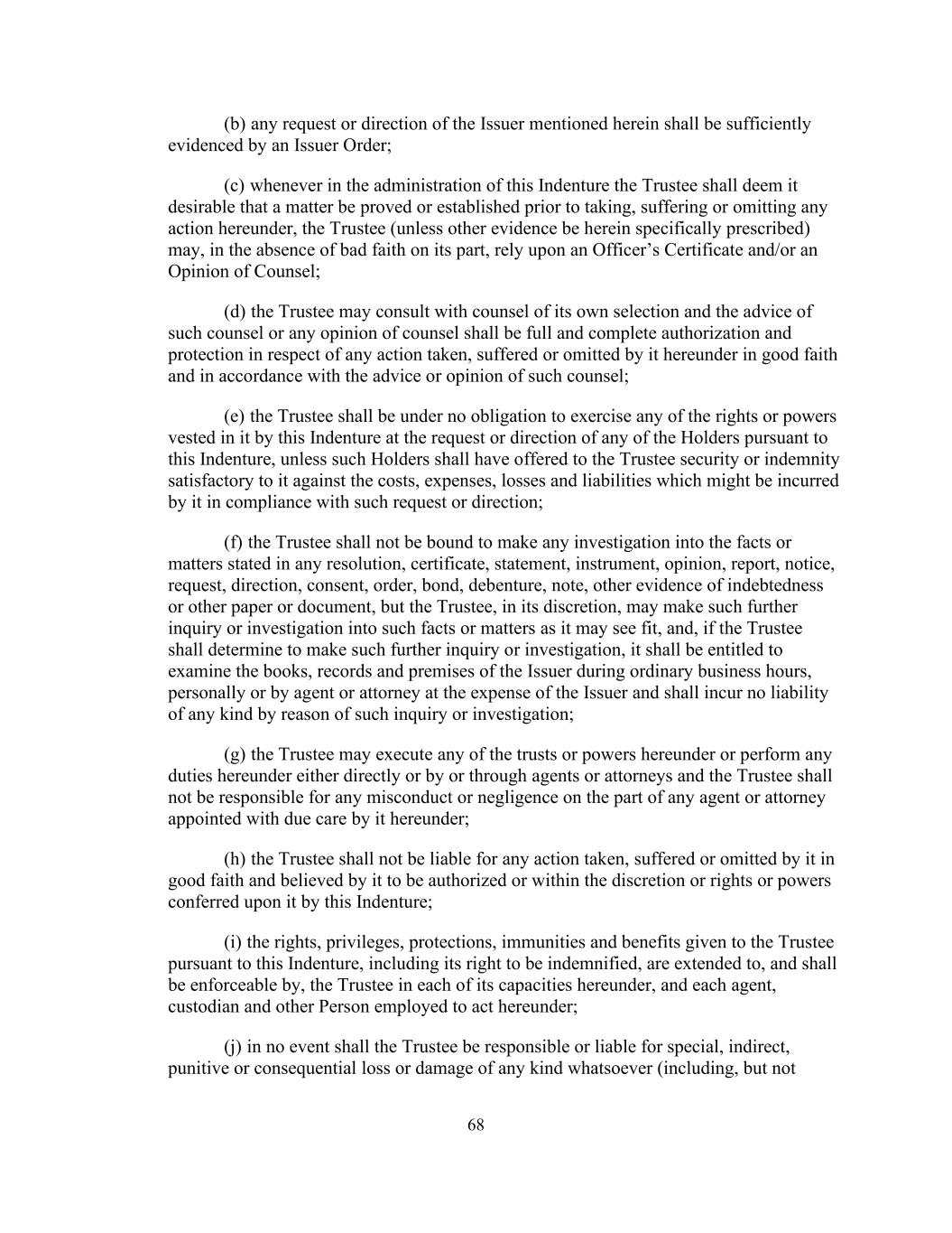 68 (b) any request or direction of the Issuer mentioned herein shall be sufficiently evidenced by an Issuer Order; (c) whenever in the administration of this Indenture the Trustee shall deem it desirable that a matter be proved or established prior to taking, suffering or omitting any action hereunder, the Trustee (unless other evidence be herein specifically prescribed) may, in the absence of bad faith on its part, rely upon an Officer’s Certificate and/or an Opinion of Counsel; (d) the Trustee may consult with counsel of its own selection and the advice of such counsel or any opinion of counsel shall be full and complete authorization and protection in respect of any action taken, suffered or omitted by it hereunder in good faith and in accordance with the advice or opinion of such counsel; (e) the Trustee shall be under no obligation to exercise any of the rights or powers vested in it by this Indenture at the request or direction of any of the Holders pursuant to this Indenture, unless such Holders shall have offered to the Trustee security or indemnity satisfactory to it against the costs, expenses, losses and liabilities which might be incurred by it in compliance with such request or direction; (f) the Trustee shall not be bound to make any investigation into the facts or matters stated in any resolution, certificate, statement, instrument, opinion, report, notice, request, direction, consent, order, bond, debenture, note, other evidence of indebtedness or other paper or document, but the Trustee, in its discretion, may make such further inquiry or investigation into such facts or matters as it may see fit, and, if the Trustee shall determine to make such further inquiry or investigation, it shall be entitled to examine the books, records and premises of the Issuer during ordinary business hours, personally or by agent or attorney at the expense of the Issuer and shall incur no liability of any kind by reason of such inquiry or investigation; (g) the Trustee may execute any of the trusts or powers hereunder or perform any duties hereunder either directly or by or through agents or attorneys and the Trustee shall not be responsible for any misconduct or negligence on the part of any agent or attorney appointed with due care by it hereunder; (h) the Trustee shall not be liable for any action taken, suffered or omitted by it in good faith and believed by it to be authorized or within the discretion or rights or powers conferred upon it by this Indenture; (i) the rights, privileges, protections, immunities and benefits given to the Trustee pursuant to this Indenture, including its right to be indemnified, are extended to, and shall be enforceable by, the Trustee in each of its capacities hereunder, and each agent, custodian and other Person employed to act hereunder; (j) in no event shall the Trustee be responsible or liable for special, indirect, punitive or consequential loss or damage of any kind whatsoever (including, but not