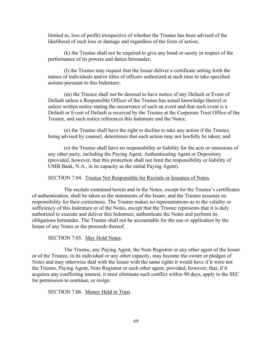 69 limited to, loss of profit) irrespective of whether the Trustee has been advised of the likelihood of such loss or damage and regardless of the form of action; (k) the Trustee shall not be required to give any bond or surety in respect of the performance of its powers and duties hereunder; (l) the Trustee may request that the Issuer deliver a certificate setting forth the names of individuals and/or titles of officers authorized at such time to take specified actions pursuant to this Indenture; (m) the Trustee shall not be deemed to have notice of any Default or Event of Default unless a Responsible Officer of the Trustee has actual knowledge thereof or unless written notice stating the occurrence of such an event and that such event is a Default or Event of Default is received by the Trustee at the Corporate Trust Office of the Trustee, and such notice references this Indenture and the Notes; (n) the Trustee shall have the right to decline to take any action if the Trustee, being advised by counsel, determines that such action may not lawfully be taken; and (o) the Trustee shall have no responsibility or liability for the acts or omissions of any other party, including the Paying Agent, Authenticating Agent or Depository (provided, however, that this protection shall not limit the responsibility or liability of UMB Bank, N.A., in its capacity as the initial Paying Agent). SECTION 7.04. Trustee Not Responsible for Recitals or Issuance of Notes. The recitals contained herein and in the Notes, except for the Trustee’s certificates of authentication, shall be taken as the statements of the Issuer, and the Trustee assumes no responsibility for their correctness. The Trustee makes no representations as to the validity or sufficiency of this Indenture or of the Notes, except that the Trustee represents that it is duly authorized to execute and deliver this Indenture, authenticate the Notes and perform its obligations hereunder. The Trustee shall not be accountable for the use or application by the Issuer of any Notes or the proceeds thereof. SECTION 7.05. May Hold Notes. The Trustee, any Paying Agent, the Note Registrar or any other agent of the Issuer or of the Trustee, in its individual or any other capacity, may become the owner or pledgee of Notes and may otherwise deal with the Issuer with the same rights it would have if it were not the Trustee, Paying Agent, Note Registrar or such other agent; provided, however, that, if it acquires any conflicting interest, it must eliminate such conflict within 90 days, apply to the SEC for permission to continue, or resign. SECTION 7.06. Money Held in Trust.