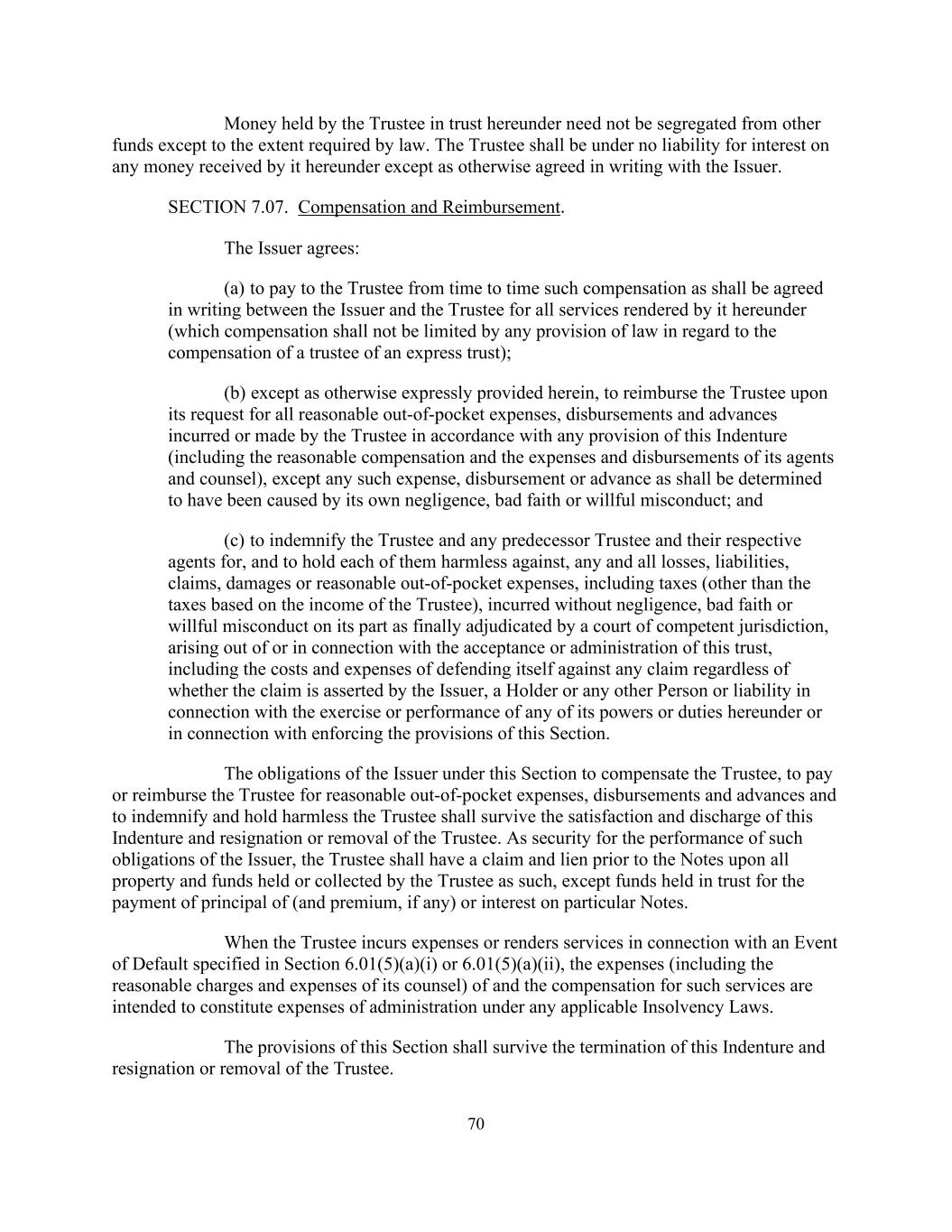 70 Money held by the Trustee in trust hereunder need not be segregated from other funds except to the extent required by law. The Trustee shall be under no liability for interest on any money received by it hereunder except as otherwise agreed in writing with the Issuer. SECTION 7.07. Compensation and Reimbursement. The Issuer agrees: (a) to pay to the Trustee from time to time such compensation as shall be agreed in writing between the Issuer and the Trustee for all services rendered by it hereunder (which compensation shall not be limited by any provision of law in regard to the compensation of a trustee of an express trust); (b) except as otherwise expressly provided herein, to reimburse the Trustee upon its request for all reasonable out-of-pocket expenses, disbursements and advances incurred or made by the Trustee in accordance with any provision of this Indenture (including the reasonable compensation and the expenses and disbursements of its agents and counsel), except any such expense, disbursement or advance as shall be determined to have been caused by its own negligence, bad faith or willful misconduct; and (c) to indemnify the Trustee and any predecessor Trustee and their respective agents for, and to hold each of them harmless against, any and all losses, liabilities, claims, damages or reasonable out-of-pocket expenses, including taxes (other than the taxes based on the income of the Trustee), incurred without negligence, bad faith or willful misconduct on its part as finally adjudicated by a court of competent jurisdiction, arising out of or in connection with the acceptance or administration of this trust, including the costs and expenses of defending itself against any claim regardless of whether the claim is asserted by the Issuer, a Holder or any other Person or liability in connection with the exercise or performance of any of its powers or duties hereunder or in connection with enforcing the provisions of this Section. The obligations of the Issuer under this Section to compensate the Trustee, to pay or reimburse the Trustee for reasonable out-of-pocket expenses, disbursements and advances and to indemnify and hold harmless the Trustee shall survive the satisfaction and discharge of this Indenture and resignation or removal of the Trustee. As security for the performance of such obligations of the Issuer, the Trustee shall have a claim and lien prior to the Notes upon all property and funds held or collected by the Trustee as such, except funds held in trust for the payment of principal of (and premium, if any) or interest on particular Notes. When the Trustee incurs expenses or renders services in connection with an Event of Default specified in Section 6.01(5)(a)(i) or 6.01(5)(a)(ii), the expenses (including the reasonable charges and expenses of its counsel) of and the compensation for such services are intended to constitute expenses of administration under any applicable Insolvency Laws. The provisions of this Section shall survive the termination of this Indenture and resignation or removal of the Trustee.