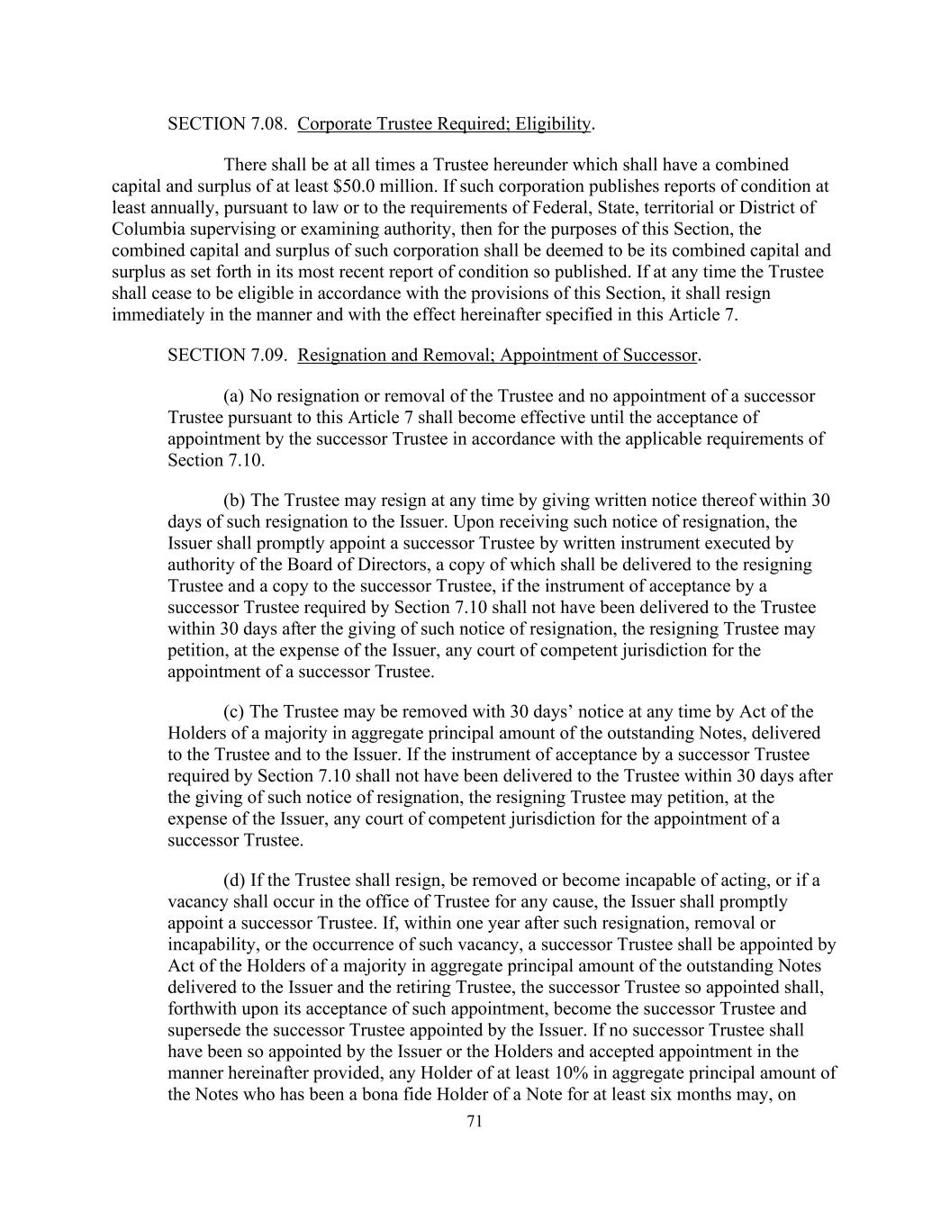 71 SECTION 7.08. Corporate Trustee Required; Eligibility. There shall be at all times a Trustee hereunder which shall have a combined capital and surplus of at least $50.0 million. If such corporation publishes reports of condition at least annually, pursuant to law or to the requirements of Federal, State, territorial or District of Columbia supervising or examining authority, then for the purposes of this Section, the combined capital and surplus of such corporation shall be deemed to be its combined capital and surplus as set forth in its most recent report of condition so published. If at any time the Trustee shall cease to be eligible in accordance with the provisions of this Section, it shall resign immediately in the manner and with the effect hereinafter specified in this Article 7. SECTION 7.09. Resignation and Removal; Appointment of Successor. (a) No resignation or removal of the Trustee and no appointment of a successor Trustee pursuant to this Article 7 shall become effective until the acceptance of appointment by the successor Trustee in accordance with the applicable requirements of Section 7.10. (b) The Trustee may resign at any time by giving written notice thereof within 30 days of such resignation to the Issuer. Upon receiving such notice of resignation, the Issuer shall promptly appoint a successor Trustee by written instrument executed by authority of the Board of Directors, a copy of which shall be delivered to the resigning Trustee and a copy to the successor Trustee, if the instrument of acceptance by a successor Trustee required by Section 7.10 shall not have been delivered to the Trustee within 30 days after the giving of such notice of resignation, the resigning Trustee may petition, at the expense of the Issuer, any court of competent jurisdiction for the appointment of a successor Trustee. (c) The Trustee may be removed with 30 days’ notice at any time by Act of the Holders of a majority in aggregate principal amount of the outstanding Notes, delivered to the Trustee and to the Issuer. If the instrument of acceptance by a successor Trustee required by Section 7.10 shall not have been delivered to the Trustee within 30 days after the giving of such notice of resignation, the resigning Trustee may petition, at the expense of the Issuer, any court of competent jurisdiction for the appointment of a successor Trustee. (d) If the Trustee shall resign, be removed or become incapable of acting, or if a vacancy shall occur in the office of Trustee for any cause, the Issuer shall promptly appoint a successor Trustee. If, within one year after such resignation, removal or incapability, or the occurrence of such vacancy, a successor Trustee shall be appointed by Act of the Holders of a majority in aggregate principal amount of the outstanding Notes delivered to the Issuer and the retiring Trustee, the successor Trustee so appointed shall, forthwith upon its acceptance of such appointment, become the successor Trustee and supersede the successor Trustee appointed by the Issuer. If no successor Trustee shall have been so appointed by the Issuer or the Holders and accepted appointment in the manner hereinafter provided, any Holder of at least 10% in aggregate principal amount of the Notes who has been a bona fide Holder of a Note for at least six months may, on