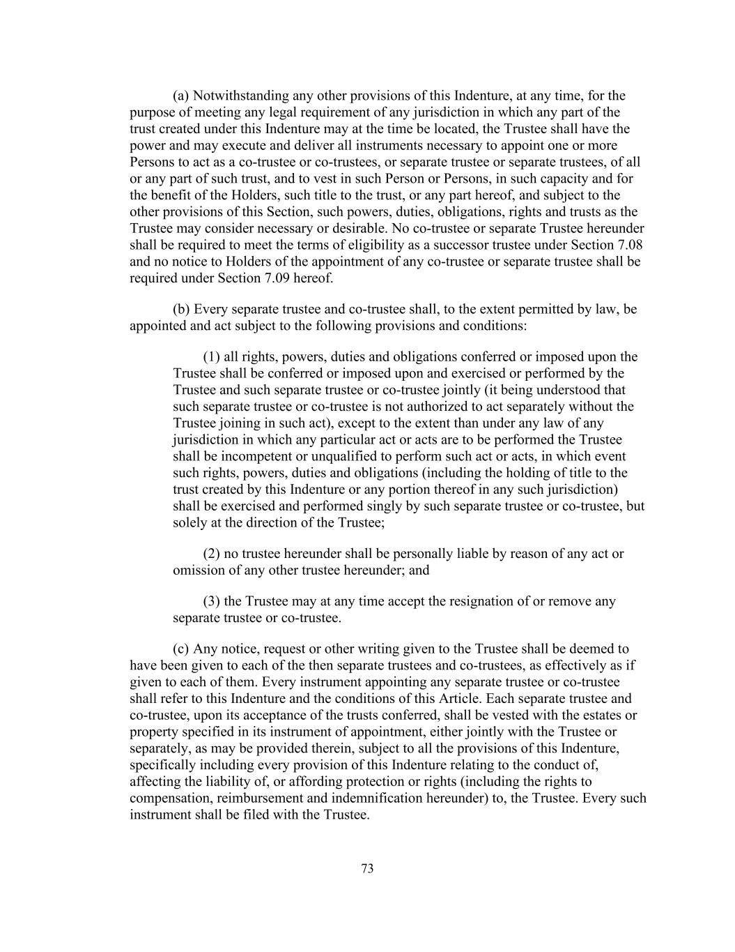 73 (a) Notwithstanding any other provisions of this Indenture, at any time, for the purpose of meeting any legal requirement of any jurisdiction in which any part of the trust created under this Indenture may at the time be located, the Trustee shall have the power and may execute and deliver all instruments necessary to appoint one or more Persons to act as a co-trustee or co-trustees, or separate trustee or separate trustees, of all or any part of such trust, and to vest in such Person or Persons, in such capacity and for the benefit of the Holders, such title to the trust, or any part hereof, and subject to the other provisions of this Section, such powers, duties, obligations, rights and trusts as the Trustee may consider necessary or desirable. No co-trustee or separate Trustee hereunder shall be required to meet the terms of eligibility as a successor trustee under Section 7.08 and no notice to Holders of the appointment of any co-trustee or separate trustee shall be required under Section 7.09 hereof. (b) Every separate trustee and co-trustee shall, to the extent permitted by law, be appointed and act subject to the following provisions and conditions: (1) all rights, powers, duties and obligations conferred or imposed upon the Trustee shall be conferred or imposed upon and exercised or performed by the Trustee and such separate trustee or co-trustee jointly (it being understood that such separate trustee or co-trustee is not authorized to act separately without the Trustee joining in such act), except to the extent than under any law of any jurisdiction in which any particular act or acts are to be performed the Trustee shall be incompetent or unqualified to perform such act or acts, in which event such rights, powers, duties and obligations (including the holding of title to the trust created by this Indenture or any portion thereof in any such jurisdiction) shall be exercised and performed singly by such separate trustee or co-trustee, but solely at the direction of the Trustee; (2) no trustee hereunder shall be personally liable by reason of any act or omission of any other trustee hereunder; and (3) the Trustee may at any time accept the resignation of or remove any separate trustee or co-trustee. (c) Any notice, request or other writing given to the Trustee shall be deemed to have been given to each of the then separate trustees and co-trustees, as effectively as if given to each of them. Every instrument appointing any separate trustee or co-trustee shall refer to this Indenture and the conditions of this Article. Each separate trustee and co-trustee, upon its acceptance of the trusts conferred, shall be vested with the estates or property specified in its instrument of appointment, either jointly with the Trustee or separately, as may be provided therein, subject to all the provisions of this Indenture, specifically including every provision of this Indenture relating to the conduct of, affecting the liability of, or affording protection or rights (including the rights to compensation, reimbursement and indemnification hereunder) to, the Trustee. Every such instrument shall be filed with the Trustee.