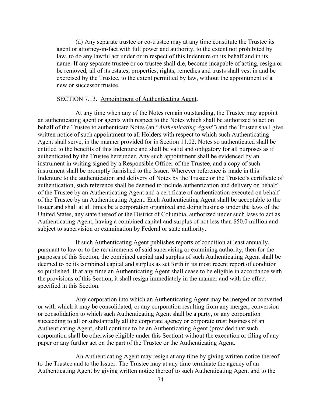 74 (d) Any separate trustee or co-trustee may at any time constitute the Trustee its agent or attorney-in-fact with full power and authority, to the extent not prohibited by law, to do any lawful act under or in respect of this Indenture on its behalf and in its name. If any separate trustee or co-trustee shall die, become incapable of acting, resign or be removed, all of its estates, properties, rights, remedies and trusts shall vest in and be exercised by the Trustee, to the extent permitted by law, without the appointment of a new or successor trustee. SECTION 7.13. Appointment of Authenticating Agent. At any time when any of the Notes remain outstanding, the Trustee may appoint an authenticating agent or agents with respect to the Notes which shall be authorized to act on behalf of the Trustee to authenticate Notes (an “Authenticating Agent”) and the Trustee shall give written notice of such appointment to all Holders with respect to which such Authenticating Agent shall serve, in the manner provided for in Section 11.02. Notes so authenticated shall be entitled to the benefits of this Indenture and shall be valid and obligatory for all purposes as if authenticated by the Trustee hereunder. Any such appointment shall be evidenced by an instrument in writing signed by a Responsible Officer of the Trustee, and a copy of such instrument shall be promptly furnished to the Issuer. Wherever reference is made in this Indenture to the authentication and delivery of Notes by the Trustee or the Trustee’s certificate of authentication, such reference shall be deemed to include authentication and delivery on behalf of the Trustee by an Authenticating Agent and a certificate of authentication executed on behalf of the Trustee by an Authenticating Agent. Each Authenticating Agent shall be acceptable to the Issuer and shall at all times be a corporation organized and doing business under the laws of the United States, any state thereof or the District of Columbia, authorized under such laws to act as Authenticating Agent, having a combined capital and surplus of not less than $50.0 million and subject to supervision or examination by Federal or state authority. If such Authenticating Agent publishes reports of condition at least annually, pursuant to law or to the requirements of said supervising or examining authority, then for the purposes of this Section, the combined capital and surplus of such Authenticating Agent shall be deemed to be its combined capital and surplus as set forth in its most recent report of condition so published. If at any time an Authenticating Agent shall cease to be eligible in accordance with the provisions of this Section, it shall resign immediately in the manner and with the effect specified in this Section. Any corporation into which an Authenticating Agent may be merged or converted or with which it may be consolidated, or any corporation resulting from any merger, conversion or consolidation to which such Authenticating Agent shall be a party, or any corporation succeeding to all or substantially all the corporate agency or corporate trust business of an Authenticating Agent, shall continue to be an Authenticating Agent (provided that such corporation shall be otherwise eligible under this Section) without the execution or filing of any paper or any further act on the part of the Trustee or the Authenticating Agent. An Authenticating Agent may resign at any time by giving written notice thereof to the Trustee and to the Issuer. The Trustee may at any time terminate the agency of an Authenticating Agent by giving written notice thereof to such Authenticating Agent and to the