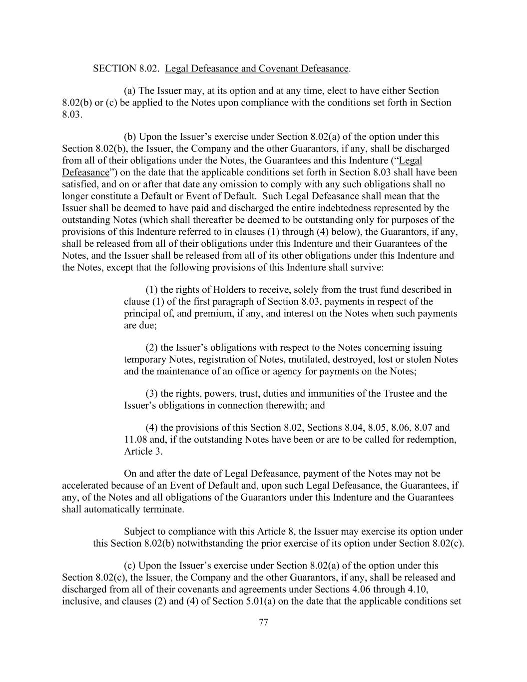 77 SECTION 8.02. Legal Defeasance and Covenant Defeasance. (a) The Issuer may, at its option and at any time, elect to have either Section 8.02(b) or (c) be applied to the Notes upon compliance with the conditions set forth in Section 8.03. (b) Upon the Issuer’s exercise under Section 8.02(a) of the option under this Section 8.02(b), the Issuer, the Company and the other Guarantors, if any, shall be discharged from all of their obligations under the Notes, the Guarantees and this Indenture (“Legal Defeasance”) on the date that the applicable conditions set forth in Section 8.03 shall have been satisfied, and on or after that date any omission to comply with any such obligations shall no longer constitute a Default or Event of Default. Such Legal Defeasance shall mean that the Issuer shall be deemed to have paid and discharged the entire indebtedness represented by the outstanding Notes (which shall thereafter be deemed to be outstanding only for purposes of the provisions of this Indenture referred to in clauses (1) through (4) below), the Guarantors, if any, shall be released from all of their obligations under this Indenture and their Guarantees of the Notes, and the Issuer shall be released from all of its other obligations under this Indenture and the Notes, except that the following provisions of this Indenture shall survive: (1) the rights of Holders to receive, solely from the trust fund described in clause (1) of the first paragraph of Section 8.03, payments in respect of the principal of, and premium, if any, and interest on the Notes when such payments are due; (2) the Issuer’s obligations with respect to the Notes concerning issuing temporary Notes, registration of Notes, mutilated, destroyed, lost or stolen Notes and the maintenance of an office or agency for payments on the Notes; (3) the rights, powers, trust, duties and immunities of the Trustee and the Issuer’s obligations in connection therewith; and (4) the provisions of this Section 8.02, Sections 8.04, 8.05, 8.06, 8.07 and 11.08 and, if the outstanding Notes have been or are to be called for redemption, Article 3. On and after the date of Legal Defeasance, payment of the Notes may not be accelerated because of an Event of Default and, upon such Legal Defeasance, the Guarantees, if any, of the Notes and all obligations of the Guarantors under this Indenture and the Guarantees shall automatically terminate. Subject to compliance with this Article 8, the Issuer may exercise its option under this Section 8.02(b) notwithstanding the prior exercise of its option under Section 8.02(c). (c) Upon the Issuer’s exercise under Section 8.02(a) of the option under this Section 8.02(c), the Issuer, the Company and the other Guarantors, if any, shall be released and discharged from all of their covenants and agreements under Sections 4.06 through 4.10, inclusive, and clauses (2) and (4) of Section 5.01(a) on the date that the applicable conditions set