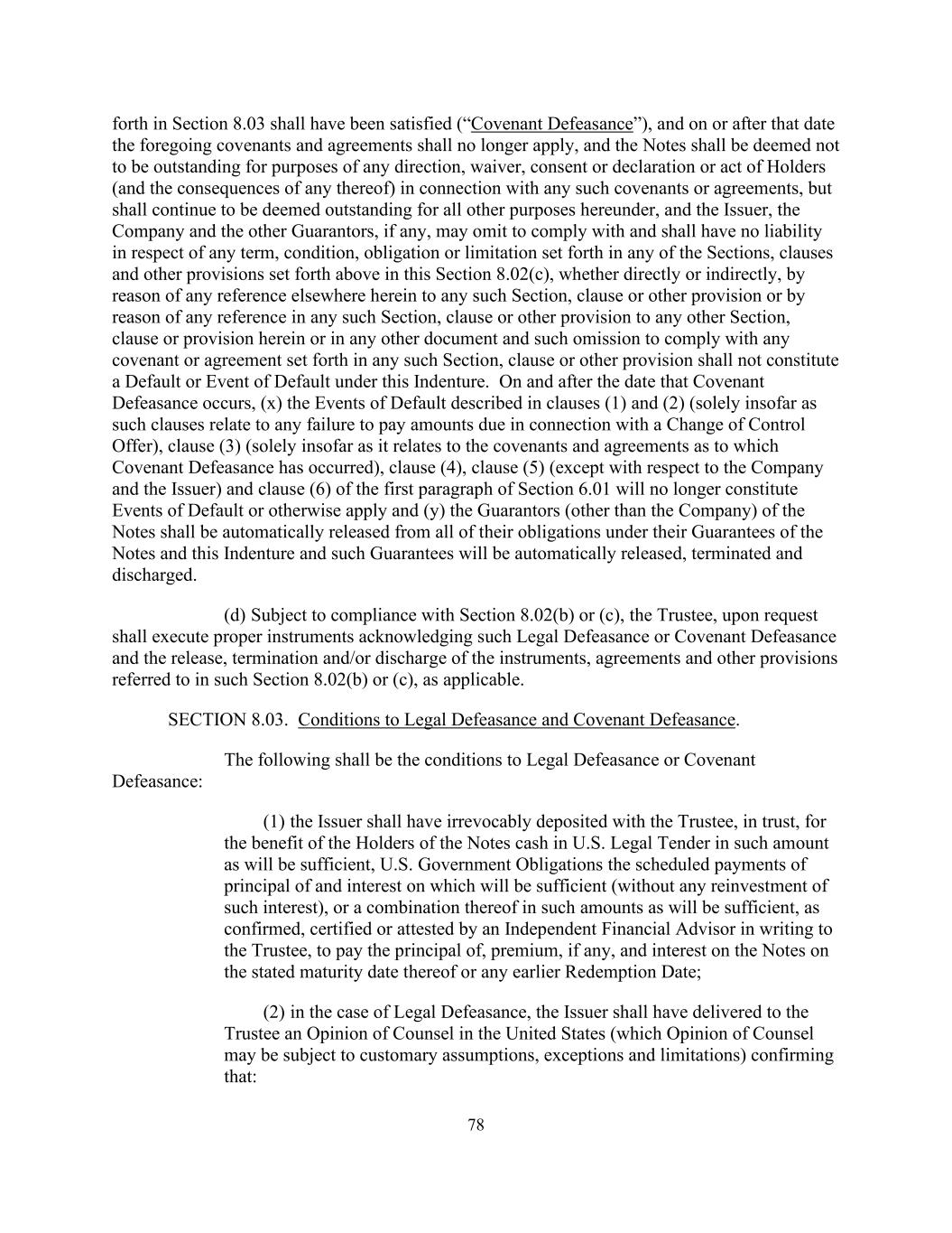 78 forth in Section 8.03 shall have been satisfied (“Covenant Defeasance”), and on or after that date the foregoing covenants and agreements shall no longer apply, and the Notes shall be deemed not to be outstanding for purposes of any direction, waiver, consent or declaration or act of Holders (and the consequences of any thereof) in connection with any such covenants or agreements, but shall continue to be deemed outstanding for all other purposes hereunder, and the Issuer, the Company and the other Guarantors, if any, may omit to comply with and shall have no liability in respect of any term, condition, obligation or limitation set forth in any of the Sections, clauses and other provisions set forth above in this Section 8.02(c), whether directly or indirectly, by reason of any reference elsewhere herein to any such Section, clause or other provision or by reason of any reference in any such Section, clause or other provision to any other Section, clause or provision herein or in any other document and such omission to comply with any covenant or agreement set forth in any such Section, clause or other provision shall not constitute a Default or Event of Default under this Indenture. On and after the date that Covenant Defeasance occurs, (x) the Events of Default described in clauses (1) and (2) (solely insofar as such clauses relate to any failure to pay amounts due in connection with a Change of Control Offer), clause (3) (solely insofar as it relates to the covenants and agreements as to which Covenant Defeasance has occurred), clause (4), clause (5) (except with respect to the Company and the Issuer) and clause (6) of the first paragraph of Section 6.01 will no longer constitute Events of Default or otherwise apply and (y) the Guarantors (other than the Company) of the Notes shall be automatically released from all of their obligations under their Guarantees of the Notes and this Indenture and such Guarantees will be automatically released, terminated and discharged. (d) Subject to compliance with Section 8.02(b) or (c), the Trustee, upon request shall execute proper instruments acknowledging such Legal Defeasance or Covenant Defeasance and the release, termination and/or discharge of the instruments, agreements and other provisions referred to in such Section 8.02(b) or (c), as applicable. SECTION 8.03. Conditions to Legal Defeasance and Covenant Defeasance. The following shall be the conditions to Legal Defeasance or Covenant Defeasance: (1) the Issuer shall have irrevocably deposited with the Trustee, in trust, for the benefit of the Holders of the Notes cash in U.S. Legal Tender in such amount as will be sufficient, U.S. Government Obligations the scheduled payments of principal of and interest on which will be sufficient (without any reinvestment of such interest), or a combination thereof in such amounts as will be sufficient, as confirmed, certified or attested by an Independent Financial Advisor in writing to the Trustee, to pay the principal of, premium, if any, and interest on the Notes on the stated maturity date thereof or any earlier Redemption Date; (2) in the case of Legal Defeasance, the Issuer shall have delivered to the Trustee an Opinion of Counsel in the United States (which Opinion of Counsel may be subject to customary assumptions, exceptions and limitations) confirming that:
