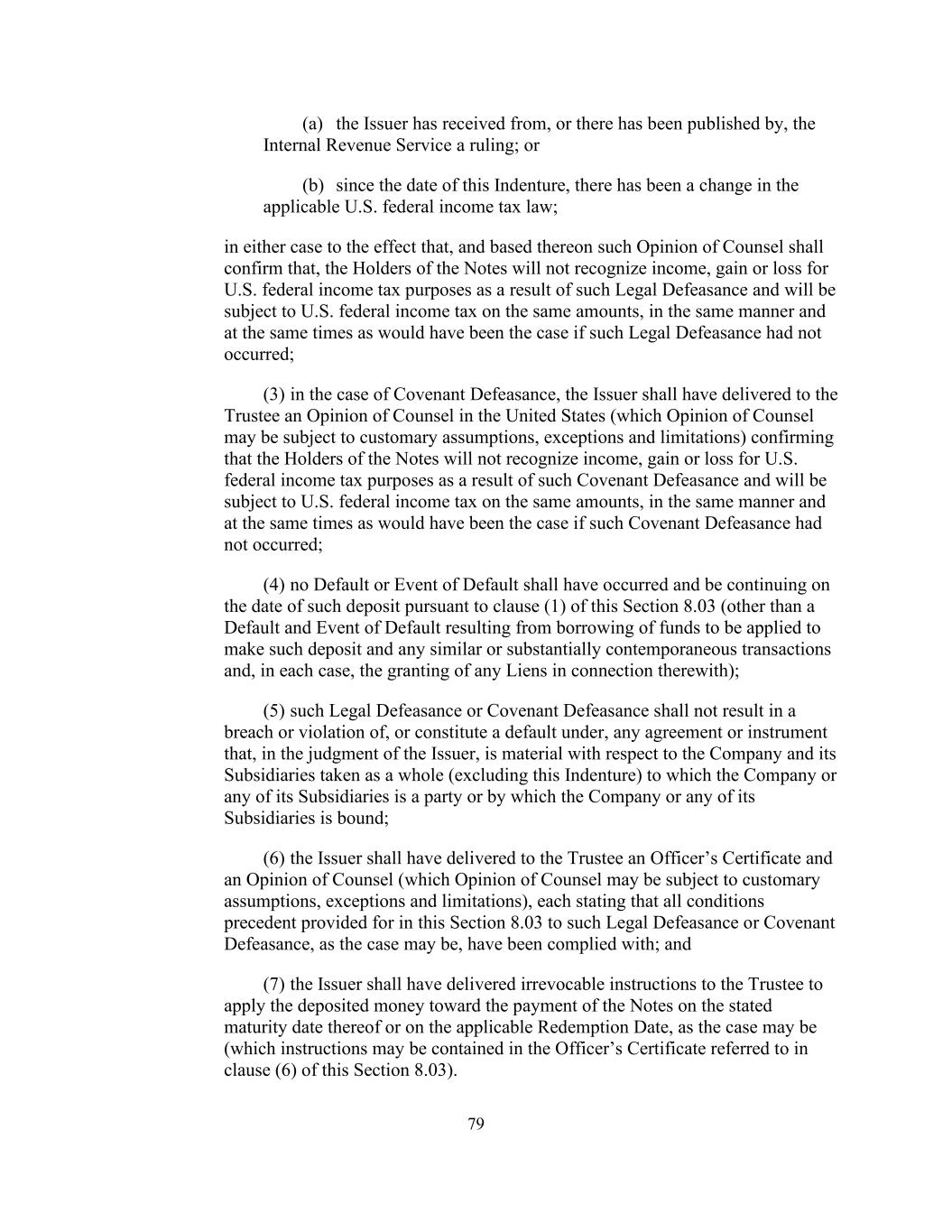 79 (a) the Issuer has received from, or there has been published by, the Internal Revenue Service a ruling; or (b) since the date of this Indenture, there has been a change in the applicable U.S. federal income tax law; in either case to the effect that, and based thereon such Opinion of Counsel shall confirm that, the Holders of the Notes will not recognize income, gain or loss for U.S. federal income tax purposes as a result of such Legal Defeasance and will be subject to U.S. federal income tax on the same amounts, in the same manner and at the same times as would have been the case if such Legal Defeasance had not occurred; (3) in the case of Covenant Defeasance, the Issuer shall have delivered to the Trustee an Opinion of Counsel in the United States (which Opinion of Counsel may be subject to customary assumptions, exceptions and limitations) confirming that the Holders of the Notes will not recognize income, gain or loss for U.S. federal income tax purposes as a result of such Covenant Defeasance and will be subject to U.S. federal income tax on the same amounts, in the same manner and at the same times as would have been the case if such Covenant Defeasance had not occurred; (4) no Default or Event of Default shall have occurred and be continuing on the date of such deposit pursuant to clause (1) of this Section 8.03 (other than a Default and Event of Default resulting from borrowing of funds to be applied to make such deposit and any similar or substantially contemporaneous transactions and, in each case, the granting of any Liens in connection therewith); (5) such Legal Defeasance or Covenant Defeasance shall not result in a breach or violation of, or constitute a default under, any agreement or instrument that, in the judgment of the Issuer, is material with respect to the Company and its Subsidiaries taken as a whole (excluding this Indenture) to which the Company or any of its Subsidiaries is a party or by which the Company or any of its Subsidiaries is bound; (6) the Issuer shall have delivered to the Trustee an Officer’s Certificate and an Opinion of Counsel (which Opinion of Counsel may be subject to customary assumptions, exceptions and limitations), each stating that all conditions precedent provided for in this Section 8.03 to such Legal Defeasance or Covenant Defeasance, as the case may be, have been complied with; and (7) the Issuer shall have delivered irrevocable instructions to the Trustee to apply the deposited money toward the payment of the Notes on the stated maturity date thereof or on the applicable Redemption Date, as the case may be (which instructions may be contained in the Officer’s Certificate referred to in clause (6) of this Section 8.03).