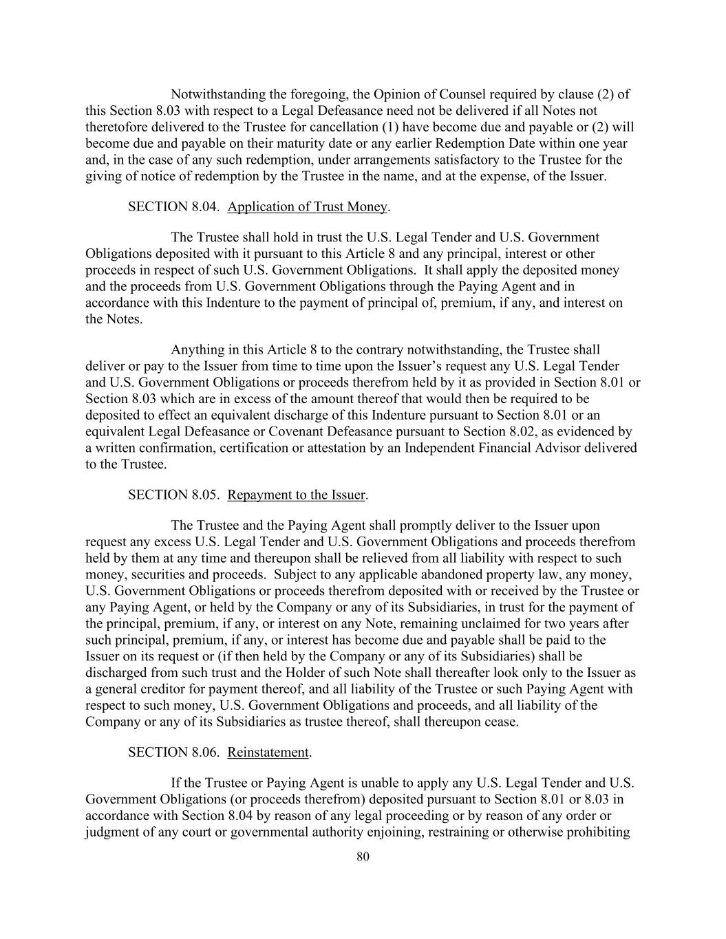 80 Notwithstanding the foregoing, the Opinion of Counsel required by clause (2) of this Section 8.03 with respect to a Legal Defeasance need not be delivered if all Notes not theretofore delivered to the Trustee for cancellation (1) have become due and payable or (2) will become due and payable on their maturity date or any earlier Redemption Date within one year and, in the case of any such redemption, under arrangements satisfactory to the Trustee for the giving of notice of redemption by the Trustee in the name, and at the expense, of the Issuer. SECTION 8.04. Application of Trust Money. The Trustee shall hold in trust the U.S. Legal Tender and U.S. Government Obligations deposited with it pursuant to this Article 8 and any principal, interest or other proceeds in respect of such U.S. Government Obligations. It shall apply the deposited money and the proceeds from U.S. Government Obligations through the Paying Agent and in accordance with this Indenture to the payment of principal of, premium, if any, and interest on the Notes. Anything in this Article 8 to the contrary notwithstanding, the Trustee shall deliver or pay to the Issuer from time to time upon the Issuer’s request any U.S. Legal Tender and U.S. Government Obligations or proceeds therefrom held by it as provided in Section 8.01 or Section 8.03 which are in excess of the amount thereof that would then be required to be deposited to effect an equivalent discharge of this Indenture pursuant to Section 8.01 or an equivalent Legal Defeasance or Covenant Defeasance pursuant to Section 8.02, as evidenced by a written confirmation, certification or attestation by an Independent Financial Advisor delivered to the Trustee. SECTION 8.05. Repayment to the Issuer. The Trustee and the Paying Agent shall promptly deliver to the Issuer upon request any excess U.S. Legal Tender and U.S. Government Obligations and proceeds therefrom held by them at any time and thereupon shall be relieved from all liability with respect to such money, securities and proceeds. Subject to any applicable abandoned property law, any money, U.S. Government Obligations or proceeds therefrom deposited with or received by the Trustee or any Paying Agent, or held by the Company or any of its Subsidiaries, in trust for the payment of the principal, premium, if any, or interest on any Note, remaining unclaimed for two years after such principal, premium, if any, or interest has become due and payable shall be paid to the Issuer on its request or (if then held by the Company or any of its Subsidiaries) shall be discharged from such trust and the Holder of such Note shall thereafter look only to the Issuer as a general creditor for payment thereof, and all liability of the Trustee or such Paying Agent with respect to such money, U.S. Government Obligations and proceeds, and all liability of the Company or any of its Subsidiaries as trustee thereof, shall thereupon cease. SECTION 8.06. Reinstatement. If the Trustee or Paying Agent is unable to apply any U.S. Legal Tender and U.S. Government Obligations (or proceeds therefrom) deposited pursuant to Section 8.01 or 8.03 in accordance with Section 8.04 by reason of any legal proceeding or by reason of any order or judgment of any court or governmental authority enjoining, restraining or otherwise prohibiting