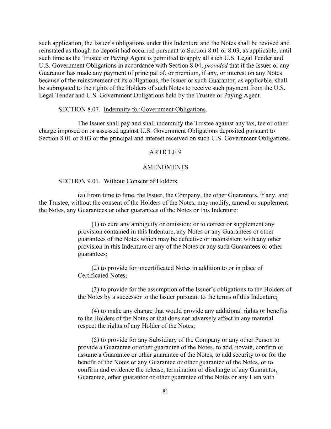 81 such application, the Issuer’s obligations under this Indenture and the Notes shall be revived and reinstated as though no deposit had occurred pursuant to Section 8.01 or 8.03, as applicable, until such time as the Trustee or Paying Agent is permitted to apply all such U.S. Legal Tender and U.S. Government Obligations in accordance with Section 8.04; provided that if the Issuer or any Guarantor has made any payment of principal of, or premium, if any, or interest on any Notes because of the reinstatement of its obligations, the Issuer or such Guarantor, as applicable, shall be subrogated to the rights of the Holders of such Notes to receive such payment from the U.S. Legal Tender and U.S. Government Obligations held by the Trustee or Paying Agent. SECTION 8.07. Indemnity for Government Obligations. The Issuer shall pay and shall indemnify the Trustee against any tax, fee or other charge imposed on or assessed against U.S. Government Obligations deposited pursuant to Section 8.01 or 8.03 or the principal and interest received on such U.S. Government Obligations. ARTICLE 9 AMENDMENTS SECTION 9.01. Without Consent of Holders. (a) From time to time, the Issuer, the Company, the other Guarantors, if any, and the Trustee, without the consent of the Holders of the Notes, may modify, amend or supplement the Notes, any Guarantees or other guarantees of the Notes or this Indenture: (1) to cure any ambiguity or omission; or to correct or supplement any provision contained in this Indenture, any Notes or any Guarantees or other guarantees of the Notes which may be defective or inconsistent with any other provision in this Indenture or any of the Notes or any such Guarantees or other guarantees; (2) to provide for uncertificated Notes in addition to or in place of Certificated Notes; (3) to provide for the assumption of the Issuer’s obligations to the Holders of the Notes by a successor to the Issuer pursuant to the terms of this Indenture; (4) to make any change that would provide any additional rights or benefits to the Holders of the Notes or that does not adversely affect in any material respect the rights of any Holder of the Notes; (5) to provide for any Subsidiary of the Company or any other Person to provide a Guarantee or other guarantee of the Notes, to add, novate, confirm or assume a Guarantee or other guarantee of the Notes, to add security to or for the benefit of the Notes or any Guarantee or other guarantee of the Notes, or to confirm and evidence the release, termination or discharge of any Guarantor, Guarantee, other guarantor or other guarantee of the Notes or any Lien with