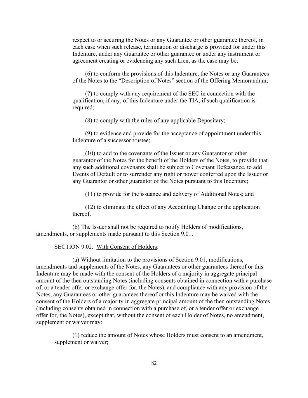 82 respect to or securing the Notes or any Guarantee or other guarantee thereof, in each case when such release, termination or discharge is provided for under this Indenture, under any Guarantee or other guarantee or under any instrument or agreement creating or evidencing any such Lien, as the case may be; (6) to conform the provisions of this Indenture, the Notes or any Guarantees of the Notes to the “Description of Notes” section of the Offering Memorandum; (7) to comply with any requirement of the SEC in connection with the qualification, if any, of this Indenture under the TIA, if such qualification is required; (8) to comply with the rules of any applicable Depositary; (9) to evidence and provide for the acceptance of appointment under this Indenture of a successor trustee; (10) to add to the covenants of the Issuer or any Guarantor or other guarantor of the Notes for the benefit of the Holders of the Notes, to provide that any such additional covenants shall be subject to Covenant Defeasance, to add Events of Default or to surrender any right or power conferred upon the Issuer or any Guarantor or other guarantor of the Notes pursuant to this Indenture; (11) to provide for the issuance and delivery of Additional Notes; and (12) to eliminate the effect of any Accounting Change or the application thereof. (b) The Issuer shall not be required to notify Holders of modifications, amendments, or supplements made pursuant to this Section 9.01. SECTION 9.02. With Consent of Holders. (a) Without limitation to the provisions of Section 9.01, modifications, amendments and supplements of the Notes, any Guarantees or other guarantees thereof or this Indenture may be made with the consent of the Holders of a majority in aggregate principal amount of the then outstanding Notes (including consents obtained in connection with a purchase of, or a tender offer or exchange offer for, the Notes), and compliance with any provision of the Notes, any Guarantees or other guarantees thereof or this Indenture may be waived with the consent of the Holders of a majority in aggregate principal amount of the then outstanding Notes (including consents obtained in connection with a purchase of, or a tender offer or exchange offer for, the Notes), except that, without the consent of each Holder of Notes, no amendment, supplement or waiver may: (1) reduce the amount of Notes whose Holders must consent to an amendment, supplement or waiver;