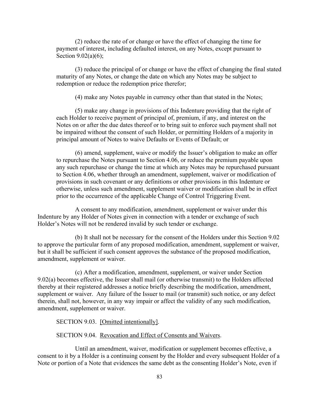 83 (2) reduce the rate of or change or have the effect of changing the time for payment of interest, including defaulted interest, on any Notes, except pursuant to Section 9.02(a)(6); (3) reduce the principal of or change or have the effect of changing the final stated maturity of any Notes, or change the date on which any Notes may be subject to redemption or reduce the redemption price therefor; (4) make any Notes payable in currency other than that stated in the Notes; (5) make any change in provisions of this Indenture providing that the right of each Holder to receive payment of principal of, premium, if any, and interest on the Notes on or after the due dates thereof or to bring suit to enforce such payment shall not be impaired without the consent of such Holder, or permitting Holders of a majority in principal amount of Notes to waive Defaults or Events of Default; or (6) amend, supplement, waive or modify the Issuer’s obligation to make an offer to repurchase the Notes pursuant to Section 4.06, or reduce the premium payable upon any such repurchase or change the time at which any Notes may be repurchased pursuant to Section 4.06, whether through an amendment, supplement, waiver or modification of provisions in such covenant or any definitions or other provisions in this Indenture or otherwise, unless such amendment, supplement waiver or modification shall be in effect prior to the occurrence of the applicable Change of Control Triggering Event. A consent to any modification, amendment, supplement or waiver under this Indenture by any Holder of Notes given in connection with a tender or exchange of such Holder’s Notes will not be rendered invalid by such tender or exchange. (b) It shall not be necessary for the consent of the Holders under this Section 9.02 to approve the particular form of any proposed modification, amendment, supplement or waiver, but it shall be sufficient if such consent approves the substance of the proposed modification, amendment, supplement or waiver. (c) After a modification, amendment, supplement, or waiver under Section 9.02(a) becomes effective, the Issuer shall mail (or otherwise transmit) to the Holders affected thereby at their registered addresses a notice briefly describing the modification, amendment, supplement or waiver. Any failure of the Issuer to mail (or transmit) such notice, or any defect therein, shall not, however, in any way impair or affect the validity of any such modification, amendment, supplement or waiver. SECTION 9.03. [Omitted intentionally]. SECTION 9.04. Revocation and Effect of Consents and Waivers. Until an amendment, waiver, modification or supplement becomes effective, a consent to it by a Holder is a continuing consent by the Holder and every subsequent Holder of a Note or portion of a Note that evidences the same debt as the consenting Holder’s Note, even if