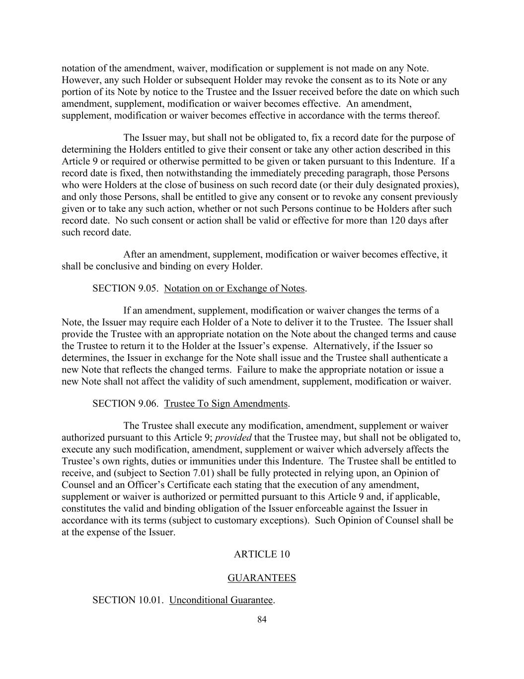 84 notation of the amendment, waiver, modification or supplement is not made on any Note. However, any such Holder or subsequent Holder may revoke the consent as to its Note or any portion of its Note by notice to the Trustee and the Issuer received before the date on which such amendment, supplement, modification or waiver becomes effective. An amendment, supplement, modification or waiver becomes effective in accordance with the terms thereof. The Issuer may, but shall not be obligated to, fix a record date for the purpose of determining the Holders entitled to give their consent or take any other action described in this Article 9 or required or otherwise permitted to be given or taken pursuant to this Indenture. If a record date is fixed, then notwithstanding the immediately preceding paragraph, those Persons who were Holders at the close of business on such record date (or their duly designated proxies), and only those Persons, shall be entitled to give any consent or to revoke any consent previously given or to take any such action, whether or not such Persons continue to be Holders after such record date. No such consent or action shall be valid or effective for more than 120 days after such record date. After an amendment, supplement, modification or waiver becomes effective, it shall be conclusive and binding on every Holder. SECTION 9.05. Notation on or Exchange of Notes. If an amendment, supplement, modification or waiver changes the terms of a Note, the Issuer may require each Holder of a Note to deliver it to the Trustee. The Issuer shall provide the Trustee with an appropriate notation on the Note about the changed terms and cause the Trustee to return it to the Holder at the Issuer’s expense. Alternatively, if the Issuer so determines, the Issuer in exchange for the Note shall issue and the Trustee shall authenticate a new Note that reflects the changed terms. Failure to make the appropriate notation or issue a new Note shall not affect the validity of such amendment, supplement, modification or waiver. SECTION 9.06. Trustee To Sign Amendments. The Trustee shall execute any modification, amendment, supplement or waiver authorized pursuant to this Article 9; provided that the Trustee may, but shall not be obligated to, execute any such modification, amendment, supplement or waiver which adversely affects the Trustee’s own rights, duties or immunities under this Indenture. The Trustee shall be entitled to receive, and (subject to Section 7.01) shall be fully protected in relying upon, an Opinion of Counsel and an Officer’s Certificate each stating that the execution of any amendment, supplement or waiver is authorized or permitted pursuant to this Article 9 and, if applicable, constitutes the valid and binding obligation of the Issuer enforceable against the Issuer in accordance with its terms (subject to customary exceptions). Such Opinion of Counsel shall be at the expense of the Issuer. ARTICLE 10 GUARANTEES SECTION 10.01. Unconditional Guarantee.