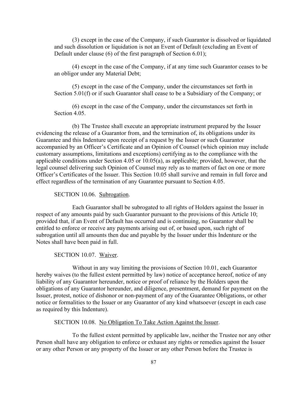 87 (3) except in the case of the Company, if such Guarantor is dissolved or liquidated and such dissolution or liquidation is not an Event of Default (excluding an Event of Default under clause (6) of the first paragraph of Section 6.01); (4) except in the case of the Company, if at any time such Guarantor ceases to be an obligor under any Material Debt; (5) except in the case of the Company, under the circumstances set forth in Section 5.01(f) or if such Guarantor shall cease to be a Subsidiary of the Company; or (6) except in the case of the Company, under the circumstances set forth in Section 4.05. (b) The Trustee shall execute an appropriate instrument prepared by the Issuer evidencing the release of a Guarantor from, and the termination of, its obligations under its Guarantee and this Indenture upon receipt of a request by the Issuer or such Guarantor accompanied by an Officer’s Certificate and an Opinion of Counsel (which opinion may include customary assumptions, limitations and exceptions) certifying as to the compliance with the applicable conditions under Section 4.05 or 10.05(a), as applicable; provided, however, that the legal counsel delivering such Opinion of Counsel may rely as to matters of fact on one or more Officer’s Certificates of the Issuer. This Section 10.05 shall survive and remain in full force and effect regardless of the termination of any Guarantee pursuant to Section 4.05. SECTION 10.06. Subrogation. Each Guarantor shall be subrogated to all rights of Holders against the Issuer in respect of any amounts paid by such Guarantor pursuant to the provisions of this Article 10; provided that, if an Event of Default has occurred and is continuing, no Guarantor shall be entitled to enforce or receive any payments arising out of, or based upon, such right of subrogation until all amounts then due and payable by the Issuer under this Indenture or the Notes shall have been paid in full. SECTION 10.07. Waiver. Without in any way limiting the provisions of Section 10.01, each Guarantor hereby waives (to the fullest extent permitted by law) notice of acceptance hereof, notice of any liability of any Guarantor hereunder, notice or proof of reliance by the Holders upon the obligations of any Guarantor hereunder, and diligence, presentment, demand for payment on the Issuer, protest, notice of dishonor or non-payment of any of the Guarantee Obligations, or other notice or formalities to the Issuer or any Guarantor of any kind whatsoever (except in each case as required by this Indenture). SECTION 10.08. No Obligation To Take Action Against the Issuer. To the fullest extent permitted by applicable law, neither the Trustee nor any other Person shall have any obligation to enforce or exhaust any rights or remedies against the Issuer or any other Person or any property of the Issuer or any other Person before the Trustee is
