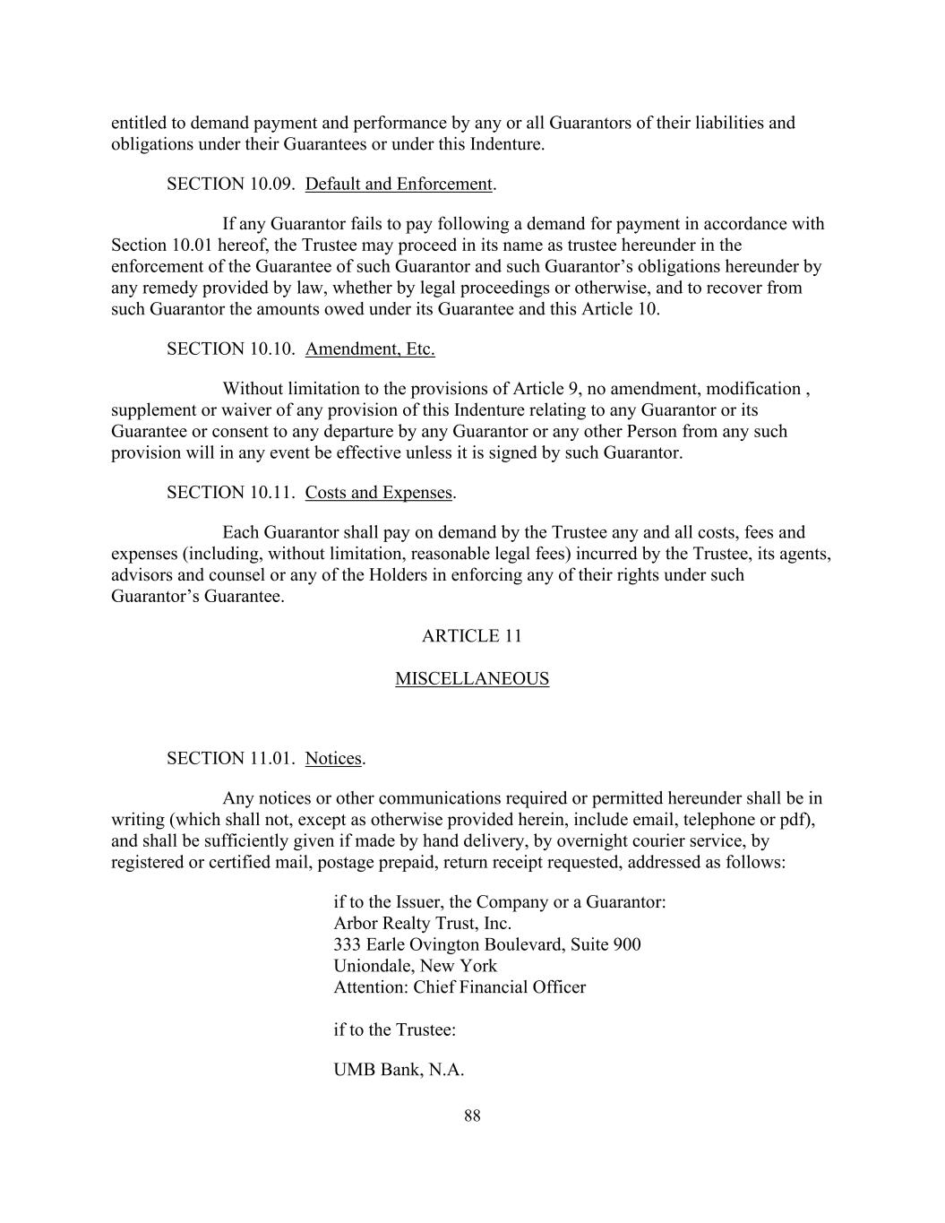 88 entitled to demand payment and performance by any or all Guarantors of their liabilities and obligations under their Guarantees or under this Indenture. SECTION 10.09. Default and Enforcement. If any Guarantor fails to pay following a demand for payment in accordance with Section 10.01 hereof, the Trustee may proceed in its name as trustee hereunder in the enforcement of the Guarantee of such Guarantor and such Guarantor’s obligations hereunder by any remedy provided by law, whether by legal proceedings or otherwise, and to recover from such Guarantor the amounts owed under its Guarantee and this Article 10. SECTION 10.10. Amendment, Etc. Without limitation to the provisions of Article 9, no amendment, modification , supplement or waiver of any provision of this Indenture relating to any Guarantor or its Guarantee or consent to any departure by any Guarantor or any other Person from any such provision will in any event be effective unless it is signed by such Guarantor. SECTION 10.11. Costs and Expenses. Each Guarantor shall pay on demand by the Trustee any and all costs, fees and expenses (including, without limitation, reasonable legal fees) incurred by the Trustee, its agents, advisors and counsel or any of the Holders in enforcing any of their rights under such Guarantor’s Guarantee. ARTICLE 11 MISCELLANEOUS SECTION 11.01. Notices. Any notices or other communications required or permitted hereunder shall be in writing (which shall not, except as otherwise provided herein, include email, telephone or pdf), and shall be sufficiently given if made by hand delivery, by overnight courier service, by registered or certified mail, postage prepaid, return receipt requested, addressed as follows: if to the Issuer, the Company or a Guarantor: Arbor Realty Trust, Inc. 333 Earle Ovington Boulevard, Suite 900 Uniondale, New York Attention: Chief Financial Officer if to the Trustee: UMB Bank, N.A.