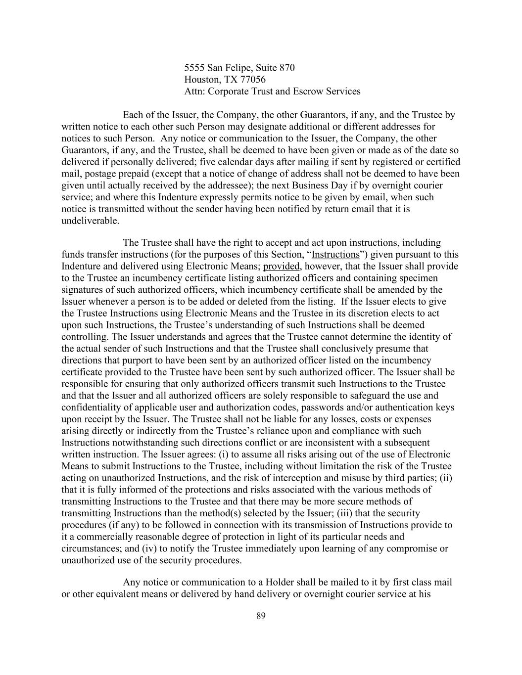 89 5555 San Felipe, Suite 870 Houston, TX 77056 Attn: Corporate Trust and Escrow Services Each of the Issuer, the Company, the other Guarantors, if any, and the Trustee by written notice to each other such Person may designate additional or different addresses for notices to such Person. Any notice or communication to the Issuer, the Company, the other Guarantors, if any, and the Trustee, shall be deemed to have been given or made as of the date so delivered if personally delivered; five calendar days after mailing if sent by registered or certified mail, postage prepaid (except that a notice of change of address shall not be deemed to have been given until actually received by the addressee); the next Business Day if by overnight courier service; and where this Indenture expressly permits notice to be given by email, when such notice is transmitted without the sender having been notified by return email that it is undeliverable. The Trustee shall have the right to accept and act upon instructions, including funds transfer instructions (for the purposes of this Section, “Instructions”) given pursuant to this Indenture and delivered using Electronic Means; provided, however, that the Issuer shall provide to the Trustee an incumbency certificate listing authorized officers and containing specimen signatures of such authorized officers, which incumbency certificate shall be amended by the Issuer whenever a person is to be added or deleted from the listing. If the Issuer elects to give the Trustee Instructions using Electronic Means and the Trustee in its discretion elects to act upon such Instructions, the Trustee’s understanding of such Instructions shall be deemed controlling. The Issuer understands and agrees that the Trustee cannot determine the identity of the actual sender of such Instructions and that the Trustee shall conclusively presume that directions that purport to have been sent by an authorized officer listed on the incumbency certificate provided to the Trustee have been sent by such authorized officer. The Issuer shall be responsible for ensuring that only authorized officers transmit such Instructions to the Trustee and that the Issuer and all authorized officers are solely responsible to safeguard the use and confidentiality of applicable user and authorization codes, passwords and/or authentication keys upon receipt by the Issuer. The Trustee shall not be liable for any losses, costs or expenses arising directly or indirectly from the Trustee’s reliance upon and compliance with such Instructions notwithstanding such directions conflict or are inconsistent with a subsequent written instruction. The Issuer agrees: (i) to assume all risks arising out of the use of Electronic Means to submit Instructions to the Trustee, including without limitation the risk of the Trustee acting on unauthorized Instructions, and the risk of interception and misuse by third parties; (ii) that it is fully informed of the protections and risks associated with the various methods of transmitting Instructions to the Trustee and that there may be more secure methods of transmitting Instructions than the method(s) selected by the Issuer; (iii) that the security procedures (if any) to be followed in connection with its transmission of Instructions provide to it a commercially reasonable degree of protection in light of its particular needs and circumstances; and (iv) to notify the Trustee immediately upon learning of any compromise or unauthorized use of the security procedures. Any notice or communication to a Holder shall be mailed to it by first class mail or other equivalent means or delivered by hand delivery or overnight courier service at his