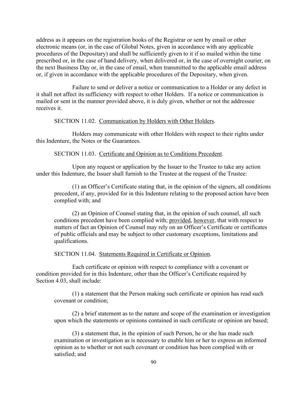 90 address as it appears on the registration books of the Registrar or sent by email or other electronic means (or, in the case of Global Notes, given in accordance with any applicable procedures of the Depositary) and shall be sufficiently given to it if so mailed within the time prescribed or, in the case of hand delivery, when delivered or, in the case of overnight courier, on the next Business Day or, in the case of email, when transmitted to the applicable email address or, if given in accordance with the applicable procedures of the Depositary, when given. Failure to send or deliver a notice or communication to a Holder or any defect in it shall not affect its sufficiency with respect to other Holders. If a notice or communication is mailed or sent in the manner provided above, it is duly given, whether or not the addressee receives it. SECTION 11.02. Communication by Holders with Other Holders. Holders may communicate with other Holders with respect to their rights under this Indenture, the Notes or the Guarantees. SECTION 11.03. Certificate and Opinion as to Conditions Precedent. Upon any request or application by the Issuer to the Trustee to take any action under this Indenture, the Issuer shall furnish to the Trustee at the request of the Trustee: (1) an Officer’s Certificate stating that, in the opinion of the signers, all conditions precedent, if any, provided for in this Indenture relating to the proposed action have been complied with; and (2) an Opinion of Counsel stating that, in the opinion of such counsel, all such conditions precedent have been complied with; provided, however, that with respect to matters of fact an Opinion of Counsel may rely on an Officer’s Certificate or certificates of public officials and may be subject to other customary exceptions, limitations and qualifications. SECTION 11.04. Statements Required in Certificate or Opinion. Each certificate or opinion with respect to compliance with a covenant or condition provided for in this Indenture, other than the Officer’s Certificate required by Section 4.03, shall include: (1) a statement that the Person making such certificate or opinion has read such covenant or condition; (2) a brief statement as to the nature and scope of the examination or investigation upon which the statements or opinions contained in such certificate or opinion are based; (3) a statement that, in the opinion of such Person, he or she has made such examination or investigation as is necessary to enable him or her to express an informed opinion as to whether or not such covenant or condition has been complied with or satisfied; and