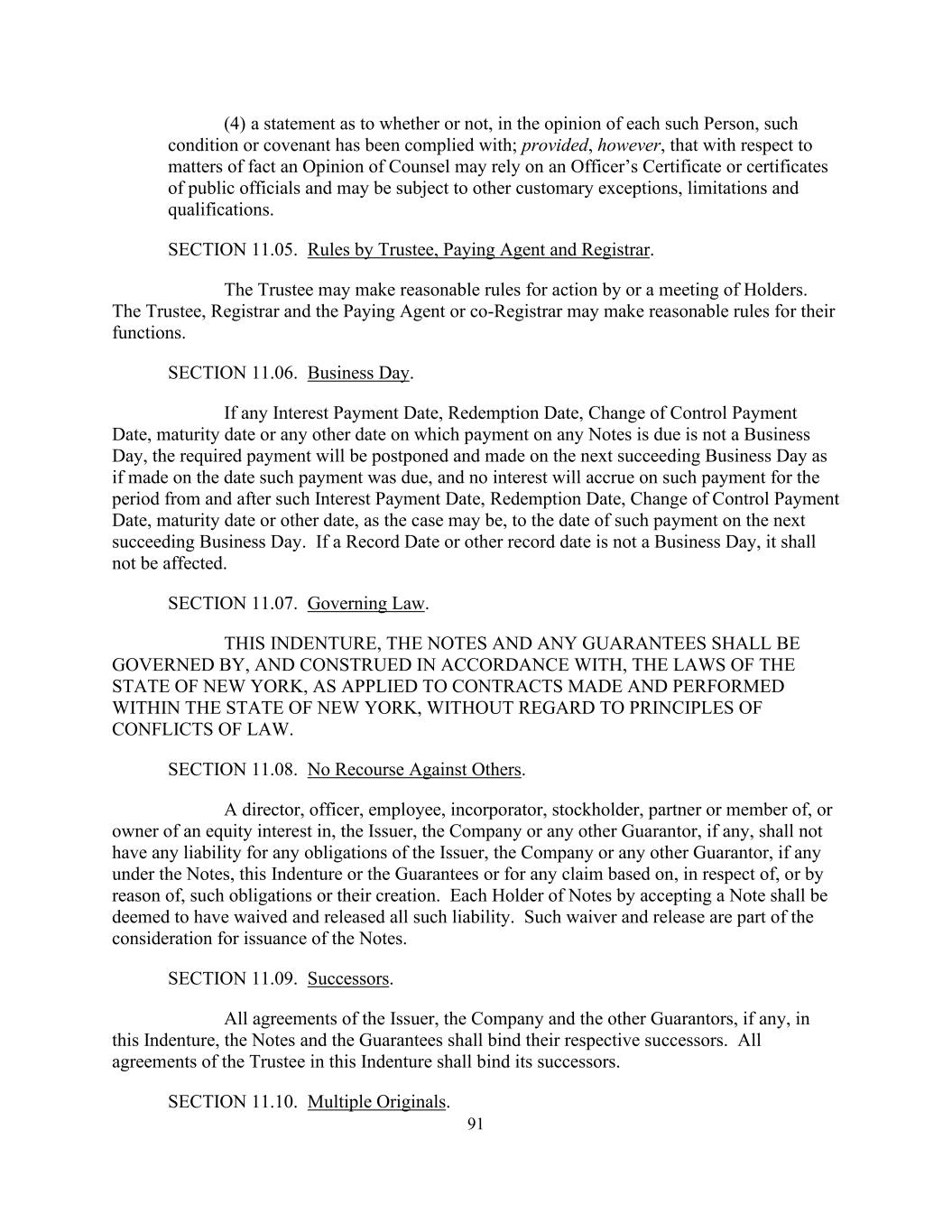 91 (4) a statement as to whether or not, in the opinion of each such Person, such condition or covenant has been complied with; provided, however, that with respect to matters of fact an Opinion of Counsel may rely on an Officer’s Certificate or certificates of public officials and may be subject to other customary exceptions, limitations and qualifications. SECTION 11.05. Rules by Trustee, Paying Agent and Registrar. The Trustee may make reasonable rules for action by or a meeting of Holders. The Trustee, Registrar and the Paying Agent or co-Registrar may make reasonable rules for their functions. SECTION 11.06. Business Day. If any Interest Payment Date, Redemption Date, Change of Control Payment Date, maturity date or any other date on which payment on any Notes is due is not a Business Day, the required payment will be postponed and made on the next succeeding Business Day as if made on the date such payment was due, and no interest will accrue on such payment for the period from and after such Interest Payment Date, Redemption Date, Change of Control Payment Date, maturity date or other date, as the case may be, to the date of such payment on the next succeeding Business Day. If a Record Date or other record date is not a Business Day, it shall not be affected. SECTION 11.07. Governing Law. THIS INDENTURE, THE NOTES AND ANY GUARANTEES SHALL BE GOVERNED BY, AND CONSTRUED IN ACCORDANCE WITH, THE LAWS OF THE STATE OF NEW YORK, AS APPLIED TO CONTRACTS MADE AND PERFORMED WITHIN THE STATE OF NEW YORK, WITHOUT REGARD TO PRINCIPLES OF CONFLICTS OF LAW. SECTION 11.08. No Recourse Against Others. A director, officer, employee, incorporator, stockholder, partner or member of, or owner of an equity interest in, the Issuer, the Company or any other Guarantor, if any, shall not have any liability for any obligations of the Issuer, the Company or any other Guarantor, if any under the Notes, this Indenture or the Guarantees or for any claim based on, in respect of, or by reason of, such obligations or their creation. Each Holder of Notes by accepting a Note shall be deemed to have waived and released all such liability. Such waiver and release are part of the consideration for issuance of the Notes. SECTION 11.09. Successors. All agreements of the Issuer, the Company and the other Guarantors, if any, in this Indenture, the Notes and the Guarantees shall bind their respective successors. All agreements of the Trustee in this Indenture shall bind its successors. SECTION 11.10. Multiple Originals.