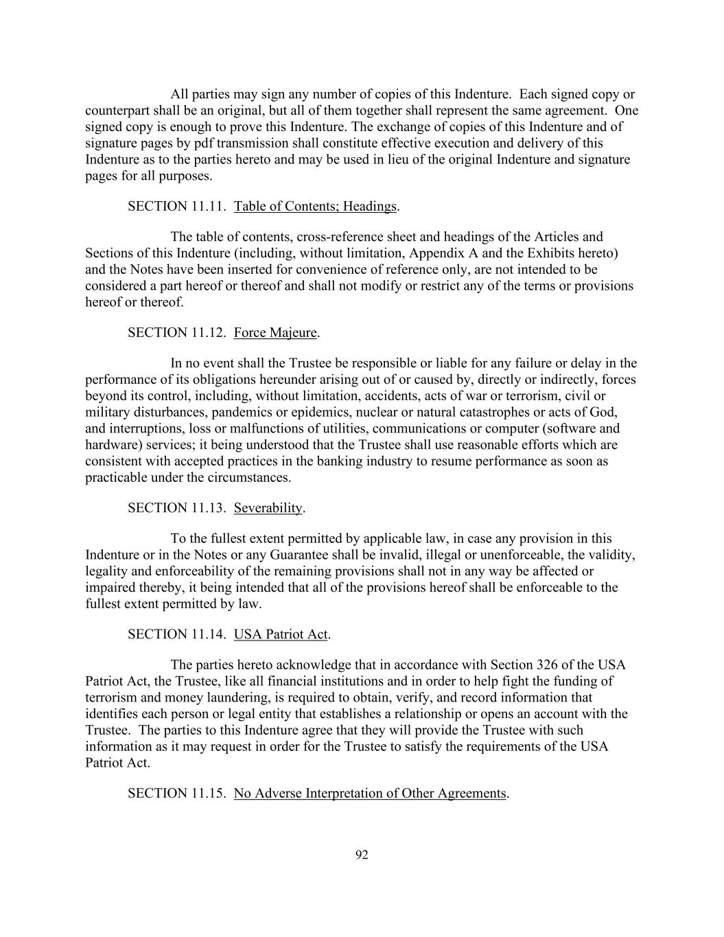 92 All parties may sign any number of copies of this Indenture. Each signed copy or counterpart shall be an original, but all of them together shall represent the same agreement. One signed copy is enough to prove this Indenture. The exchange of copies of this Indenture and of signature pages by pdf transmission shall constitute effective execution and delivery of this Indenture as to the parties hereto and may be used in lieu of the original Indenture and signature pages for all purposes. SECTION 11.11. Table of Contents; Headings. The table of contents, cross-reference sheet and headings of the Articles and Sections of this Indenture (including, without limitation, Appendix A and the Exhibits hereto) and the Notes have been inserted for convenience of reference only, are not intended to be considered a part hereof or thereof and shall not modify or restrict any of the terms or provisions hereof or thereof. SECTION 11.12. Force Majeure. In no event shall the Trustee be responsible or liable for any failure or delay in the performance of its obligations hereunder arising out of or caused by, directly or indirectly, forces beyond its control, including, without limitation, accidents, acts of war or terrorism, civil or military disturbances, pandemics or epidemics, nuclear or natural catastrophes or acts of God, and interruptions, loss or malfunctions of utilities, communications or computer (software and hardware) services; it being understood that the Trustee shall use reasonable efforts which are consistent with accepted practices in the banking industry to resume performance as soon as practicable under the circumstances. SECTION 11.13. Severability. To the fullest extent permitted by applicable law, in case any provision in this Indenture or in the Notes or any Guarantee shall be invalid, illegal or unenforceable, the validity, legality and enforceability of the remaining provisions shall not in any way be affected or impaired thereby, it being intended that all of the provisions hereof shall be enforceable to the fullest extent permitted by law. SECTION 11.14. USA Patriot Act. The parties hereto acknowledge that in accordance with Section 326 of the USA Patriot Act, the Trustee, like all financial institutions and in order to help fight the funding of terrorism and money laundering, is required to obtain, verify, and record information that identifies each person or legal entity that establishes a relationship or opens an account with the Trustee. The parties to this Indenture agree that they will provide the Trustee with such information as it may request in order for the Trustee to satisfy the requirements of the USA Patriot Act. SECTION 11.15. No Adverse Interpretation of Other Agreements.