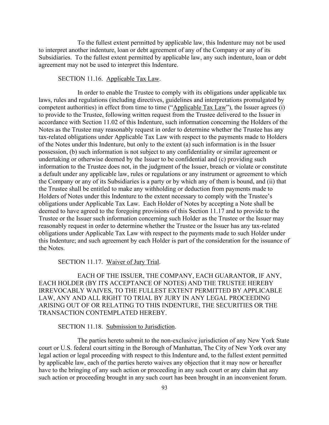 93 To the fullest extent permitted by applicable law, this Indenture may not be used to interpret another indenture, loan or debt agreement of any of the Company or any of its Subsidiaries. To the fullest extent permitted by applicable law, any such indenture, loan or debt agreement may not be used to interpret this Indenture. SECTION 11.16. Applicable Tax Law. In order to enable the Trustee to comply with its obligations under applicable tax laws, rules and regulations (including directives, guidelines and interpretations promulgated by competent authorities) in effect from time to time (“Applicable Tax Law”), the Issuer agrees (i) to provide to the Trustee, following written request from the Trustee delivered to the Issuer in accordance with Section 11.02 of this Indenture, such information concerning the Holders of the Notes as the Trustee may reasonably request in order to determine whether the Trustee has any tax-related obligations under Applicable Tax Law with respect to the payments made to Holders of the Notes under this Indenture, but only to the extent (a) such information is in the Issuer possession, (b) such information is not subject to any confidentiality or similar agreement or undertaking or otherwise deemed by the Issuer to be confidential and (c) providing such information to the Trustee does not, in the judgment of the Issuer, breach or violate or constitute a default under any applicable law, rules or regulations or any instrument or agreement to which the Company or any of its Subsidiaries is a party or by which any of them is bound, and (ii) that the Trustee shall be entitled to make any withholding or deduction from payments made to Holders of Notes under this Indenture to the extent necessary to comply with the Trustee’s obligations under Applicable Tax Law. Each Holder of Notes by accepting a Note shall be deemed to have agreed to the foregoing provisions of this Section 11.17 and to provide to the Trustee or the Issuer such information concerning such Holder as the Trustee or the Issuer may reasonably request in order to determine whether the Trustee or the Issuer has any tax-related obligations under Applicable Tax Law with respect to the payments made to such Holder under this Indenture; and such agreement by each Holder is part of the consideration for the issuance of the Notes. SECTION 11.17. Waiver of Jury Trial. EACH OF THE ISSUER, THE COMPANY, EACH GUARANTOR, IF ANY, EACH HOLDER (BY ITS ACCEPTANCE OF NOTES) AND THE TRUSTEE HEREBY IRREVOCABLY WAIVES, TO THE FULLEST EXTENT PERMITTED BY APPLICABLE LAW, ANY AND ALL RIGHT TO TRIAL BY JURY IN ANY LEGAL PROCEEDING ARISING OUT OF OR RELATING TO THIS INDENTURE, THE SECURITIES OR THE TRANSACTION CONTEMPLATED HEREBY. SECTION 11.18. Submission to Jurisdiction. The parties hereto submit to the non-exclusive jurisdiction of any New York State court or U.S. federal court sitting in the Borough of Manhattan, The City of New York over any legal action or legal proceeding with respect to this Indenture and, to the fullest extent permitted by applicable law, each of the parties hereto waives any objection that it may now or hereafter have to the bringing of any such action or proceeding in any such court or any claim that any such action or proceeding brought in any such court has been brought in an inconvenient forum.