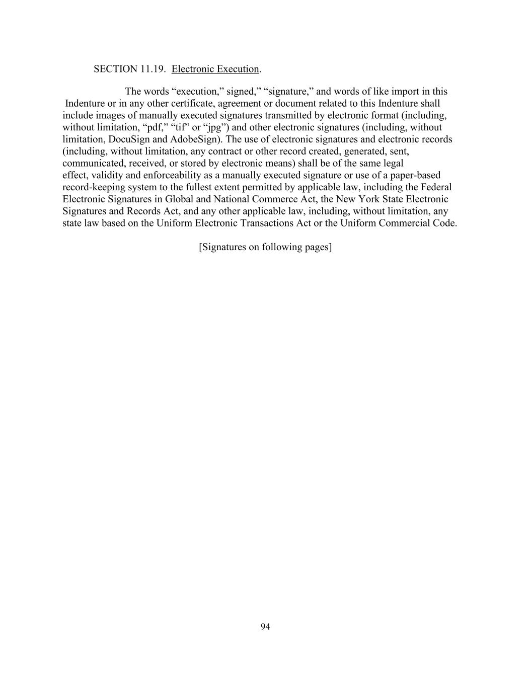 94 SECTION 11.19. Electronic Execution. The words “execution,” signed,” “signature,” and words of like import in this Indenture or in any other certificate, agreement or document related to this Indenture shall include images of manually executed signatures transmitted by electronic format (including, without limitation, “pdf,” “tif” or “jpg”) and other electronic signatures (including, without limitation, DocuSign and AdobeSign). The use of electronic signatures and electronic records (including, without limitation, any contract or other record created, generated, sent, communicated, received, or stored by electronic means) shall be of the same legal effect, validity and enforceability as a manually executed signature or use of a paper-based record-keeping system to the fullest extent permitted by applicable law, including the Federal Electronic Signatures in Global and National Commerce Act, the New York State Electronic Signatures and Records Act, and any other applicable law, including, without limitation, any state law based on the Uniform Electronic Transactions Act or the Uniform Commercial Code. [Signatures on following pages]