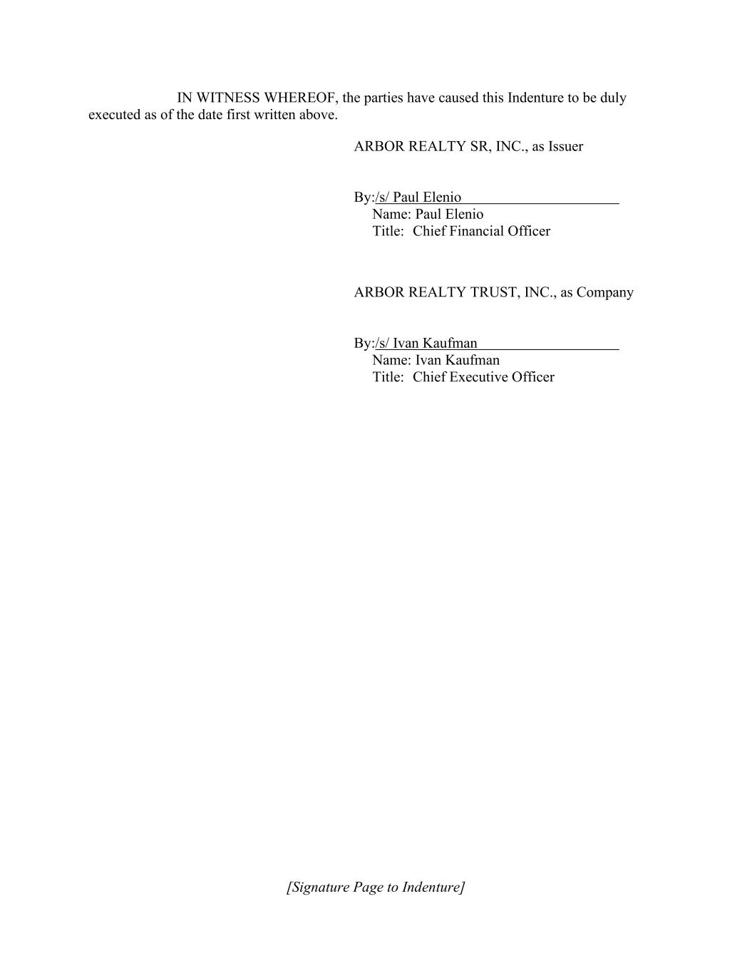 [Signature Page to Indenture] IN WITNESS WHEREOF, the parties have caused this Indenture to be duly executed as of the date first written above. ARBOR REALTY SR, INC., as Issuer By:/s/ Paul Elenio Name: Paul Elenio Title: Chief Financial Officer ARBOR REALTY TRUST, INC., as Company By:/s/ Ivan Kaufman Name: Ivan Kaufman Title: Chief Executive Officer