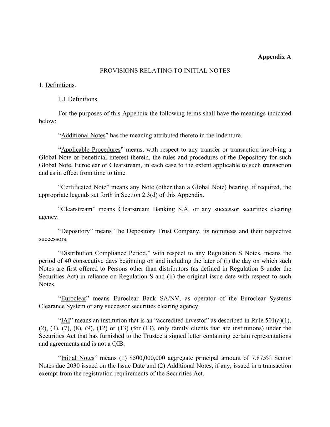 Appendix A PROVISIONS RELATING TO INITIAL NOTES 1. Definitions. 1.1 Definitions. For the purposes of this Appendix the following terms shall have the meanings indicated below: “Additional Notes” has the meaning attributed thereto in the Indenture. “Applicable Procedures” means, with respect to any transfer or transaction involving a Global Note or beneficial interest therein, the rules and procedures of the Depository for such Global Note, Euroclear or Clearstream, in each case to the extent applicable to such transaction and as in effect from time to time. “Certificated Note” means any Note (other than a Global Note) bearing, if required, the appropriate legends set forth in Section 2.3(d) of this Appendix. “Clearstream” means Clearstream Banking S.A. or any successor securities clearing agency. “Depository” means The Depository Trust Company, its nominees and their respective successors. “Distribution Compliance Period,” with respect to any Regulation S Notes, means the period of 40 consecutive days beginning on and including the later of (i) the day on which such Notes are first offered to Persons other than distributors (as defined in Regulation S under the Securities Act) in reliance on Regulation S and (ii) the original issue date with respect to such Notes. “Euroclear” means Euroclear Bank SA/NV, as operator of the Euroclear Systems Clearance System or any successor securities clearing agency. “IAI” means an institution that is an “accredited investor” as described in Rule 501(a)(1), (2), (3), (7), (8), (9), (12) or (13) (for (13), only family clients that are institutions) under the Securities Act that has furnished to the Trustee a signed letter containing certain representations and agreements and is not a QIB. “Initial Notes” means (1) $500,000,000 aggregate principal amount of 7.875% Senior Notes due 2030 issued on the Issue Date and (2) Additional Notes, if any, issued in a transaction exempt from the registration requirements of the Securities Act.