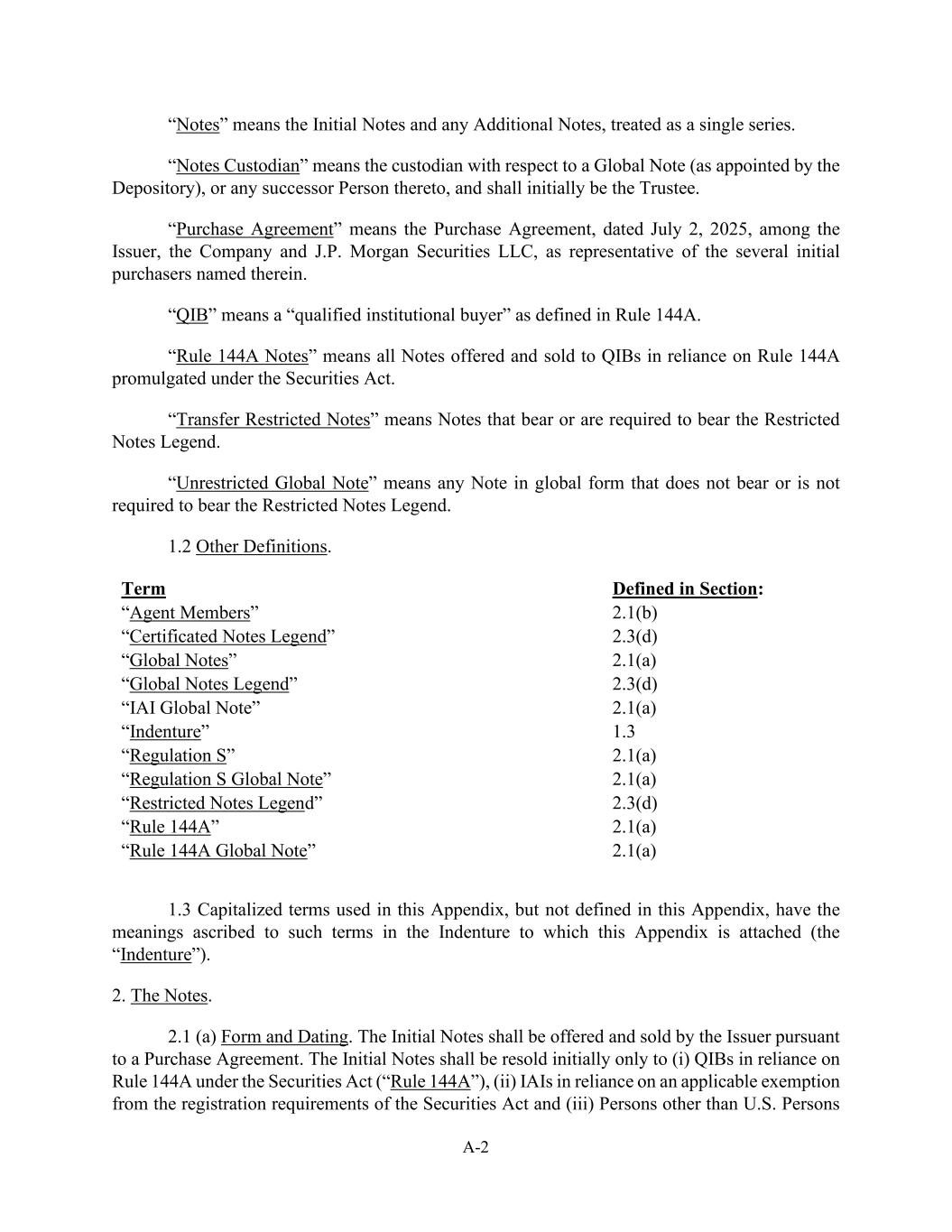 A-2 “Notes” means the Initial Notes and any Additional Notes, treated as a single series. “Notes Custodian” means the custodian with respect to a Global Note (as appointed by the Depository), or any successor Person thereto, and shall initially be the Trustee. “Purchase Agreement” means the Purchase Agreement, dated July 2, 2025, among the Issuer, the Company and J.P. Morgan Securities LLC, as representative of the several initial purchasers named therein. “QIB” means a “qualified institutional buyer” as defined in Rule 144A. “Rule 144A Notes” means all Notes offered and sold to QIBs in reliance on Rule 144A promulgated under the Securities Act. “Transfer Restricted Notes” means Notes that bear or are required to bear the Restricted Notes Legend. “Unrestricted Global Note” means any Note in global form that does not bear or is not required to bear the Restricted Notes Legend. 1.2 Other Definitions. Term Defined in Section: “Agent Members” 2.1(b) “Certificated Notes Legend” 2.3(d) “Global Notes” 2.1(a) “Global Notes Legend” 2.3(d) “IAI Global Note” 2.1(a) “Indenture” 1.3 “Regulation S” 2.1(a) “Regulation S Global Note” 2.1(a) “Restricted Notes Legend” 2.3(d) “Rule 144A” 2.1(a) “Rule 144A Global Note” 2.1(a) 1.3 Capitalized terms used in this Appendix, but not defined in this Appendix, have the meanings ascribed to such terms in the Indenture to which this Appendix is attached (the “Indenture”). 2. The Notes. 2.1 (a) Form and Dating. The Initial Notes shall be offered and sold by the Issuer pursuant to a Purchase Agreement. The Initial Notes shall be resold initially only to (i) QIBs in reliance on Rule 144A under the Securities Act (“Rule 144A”), (ii) IAIs in reliance on an applicable exemption from the registration requirements of the Securities Act and (iii) Persons other than U.S. Persons