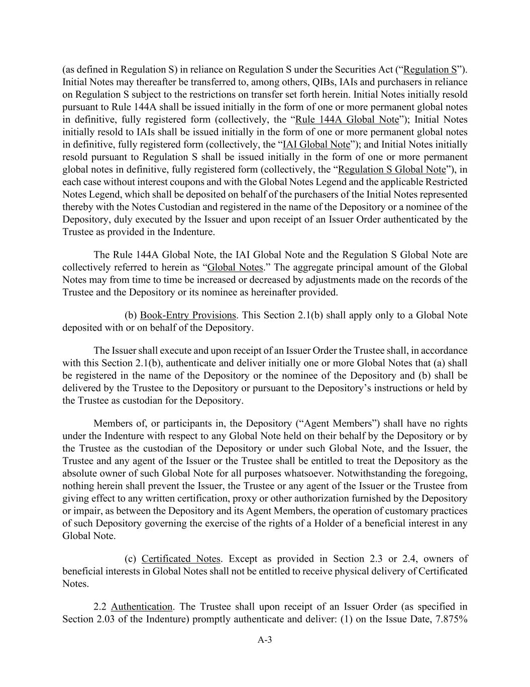 A-3 (as defined in Regulation S) in reliance on Regulation S under the Securities Act (“Regulation S”). Initial Notes may thereafter be transferred to, among others, QIBs, IAIs and purchasers in reliance on Regulation S subject to the restrictions on transfer set forth herein. Initial Notes initially resold pursuant to Rule 144A shall be issued initially in the form of one or more permanent global notes in definitive, fully registered form (collectively, the “Rule 144A Global Note”); Initial Notes initially resold to IAIs shall be issued initially in the form of one or more permanent global notes in definitive, fully registered form (collectively, the “IAI Global Note”); and Initial Notes initially resold pursuant to Regulation S shall be issued initially in the form of one or more permanent global notes in definitive, fully registered form (collectively, the “Regulation S Global Note”), in each case without interest coupons and with the Global Notes Legend and the applicable Restricted Notes Legend, which shall be deposited on behalf of the purchasers of the Initial Notes represented thereby with the Notes Custodian and registered in the name of the Depository or a nominee of the Depository, duly executed by the Issuer and upon receipt of an Issuer Order authenticated by the Trustee as provided in the Indenture. The Rule 144A Global Note, the IAI Global Note and the Regulation S Global Note are collectively referred to herein as “Global Notes.” The aggregate principal amount of the Global Notes may from time to time be increased or decreased by adjustments made on the records of the Trustee and the Depository or its nominee as hereinafter provided. (b) Book-Entry Provisions. This Section 2.1(b) shall apply only to a Global Note deposited with or on behalf of the Depository. The Issuer shall execute and upon receipt of an Issuer Order the Trustee shall, in accordance with this Section 2.1(b), authenticate and deliver initially one or more Global Notes that (a) shall be registered in the name of the Depository or the nominee of the Depository and (b) shall be delivered by the Trustee to the Depository or pursuant to the Depository’s instructions or held by the Trustee as custodian for the Depository. Members of, or participants in, the Depository (“Agent Members”) shall have no rights under the Indenture with respect to any Global Note held on their behalf by the Depository or by the Trustee as the custodian of the Depository or under such Global Note, and the Issuer, the Trustee and any agent of the Issuer or the Trustee shall be entitled to treat the Depository as the absolute owner of such Global Note for all purposes whatsoever. Notwithstanding the foregoing, nothing herein shall prevent the Issuer, the Trustee or any agent of the Issuer or the Trustee from giving effect to any written certification, proxy or other authorization furnished by the Depository or impair, as between the Depository and its Agent Members, the operation of customary practices of such Depository governing the exercise of the rights of a Holder of a beneficial interest in any Global Note. (c) Certificated Notes. Except as provided in Section 2.3 or 2.4, owners of beneficial interests in Global Notes shall not be entitled to receive physical delivery of Certificated Notes. 2.2 Authentication. The Trustee shall upon receipt of an Issuer Order (as specified in Section 2.03 of the Indenture) promptly authenticate and deliver: (1) on the Issue Date, 7.875%