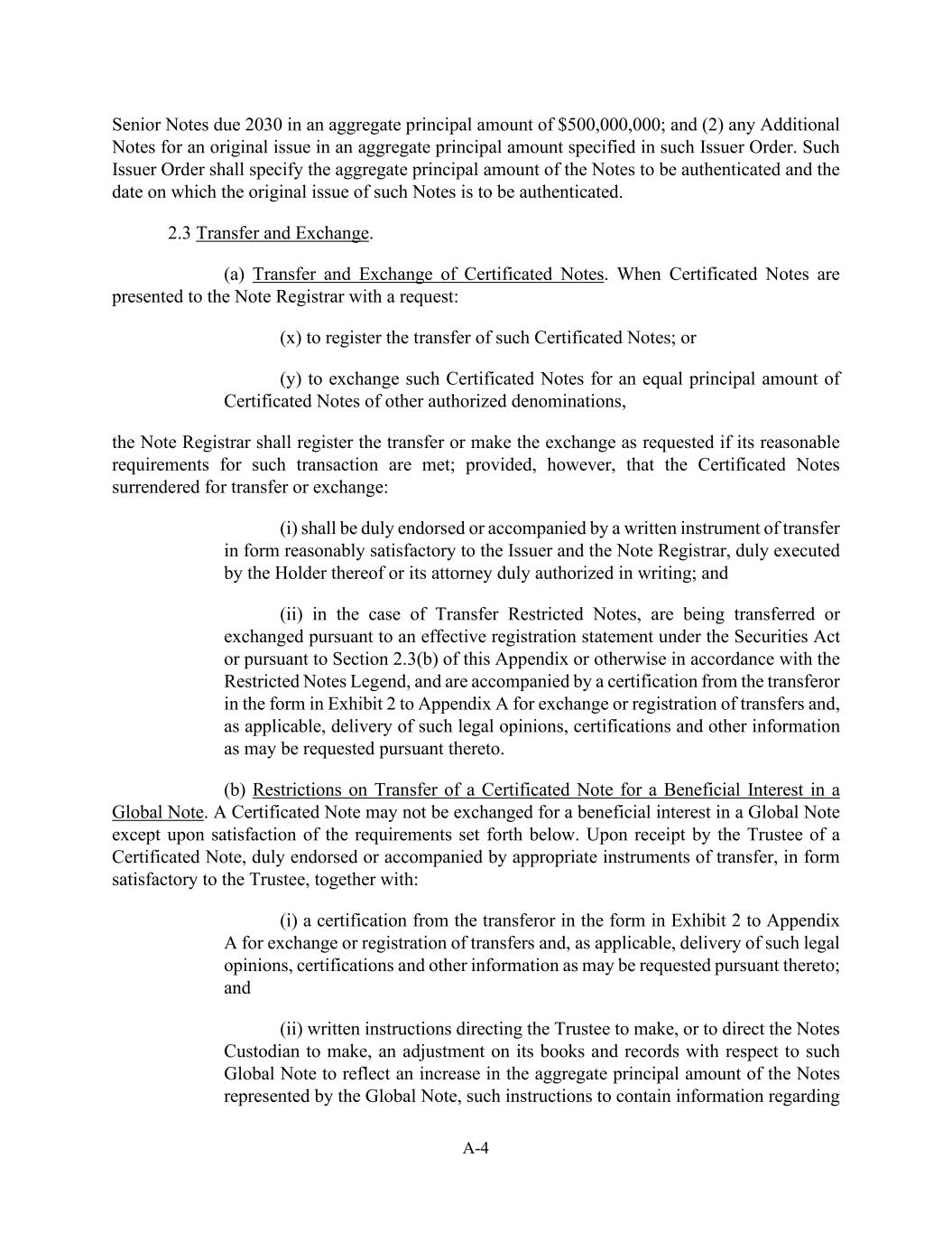 A-4 Senior Notes due 2030 in an aggregate principal amount of $500,000,000; and (2) any Additional Notes for an original issue in an aggregate principal amount specified in such Issuer Order. Such Issuer Order shall specify the aggregate principal amount of the Notes to be authenticated and the date on which the original issue of such Notes is to be authenticated. 2.3 Transfer and Exchange. (a) Transfer and Exchange of Certificated Notes. When Certificated Notes are presented to the Note Registrar with a request: (x) to register the transfer of such Certificated Notes; or (y) to exchange such Certificated Notes for an equal principal amount of Certificated Notes of other authorized denominations, the Note Registrar shall register the transfer or make the exchange as requested if its reasonable requirements for such transaction are met; provided, however, that the Certificated Notes surrendered for transfer or exchange: (i) shall be duly endorsed or accompanied by a written instrument of transfer in form reasonably satisfactory to the Issuer and the Note Registrar, duly executed by the Holder thereof or its attorney duly authorized in writing; and (ii) in the case of Transfer Restricted Notes, are being transferred or exchanged pursuant to an effective registration statement under the Securities Act or pursuant to Section 2.3(b) of this Appendix or otherwise in accordance with the Restricted Notes Legend, and are accompanied by a certification from the transferor in the form in Exhibit 2 to Appendix A for exchange or registration of transfers and, as applicable, delivery of such legal opinions, certifications and other information as may be requested pursuant thereto. (b) Restrictions on Transfer of a Certificated Note for a Beneficial Interest in a Global Note. A Certificated Note may not be exchanged for a beneficial interest in a Global Note except upon satisfaction of the requirements set forth below. Upon receipt by the Trustee of a Certificated Note, duly endorsed or accompanied by appropriate instruments of transfer, in form satisfactory to the Trustee, together with: (i) a certification from the transferor in the form in Exhibit 2 to Appendix A for exchange or registration of transfers and, as applicable, delivery of such legal opinions, certifications and other information as may be requested pursuant thereto; and (ii) written instructions directing the Trustee to make, or to direct the Notes Custodian to make, an adjustment on its books and records with respect to such Global Note to reflect an increase in the aggregate principal amount of the Notes represented by the Global Note, such instructions to contain information regarding