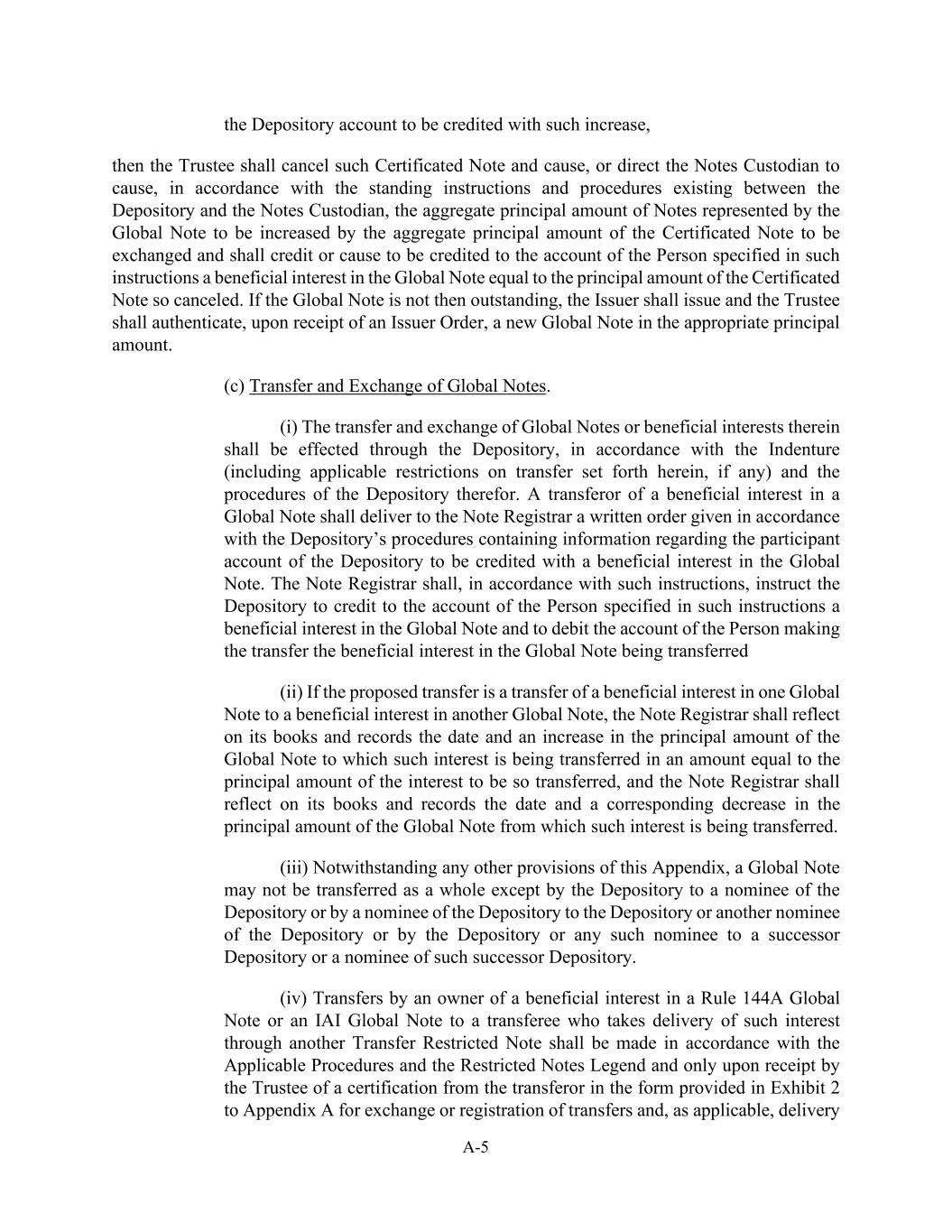 A-5 the Depository account to be credited with such increase, then the Trustee shall cancel such Certificated Note and cause, or direct the Notes Custodian to cause, in accordance with the standing instructions and procedures existing between the Depository and the Notes Custodian, the aggregate principal amount of Notes represented by the Global Note to be increased by the aggregate principal amount of the Certificated Note to be exchanged and shall credit or cause to be credited to the account of the Person specified in such instructions a beneficial interest in the Global Note equal to the principal amount of the Certificated Note so canceled. If the Global Note is not then outstanding, the Issuer shall issue and the Trustee shall authenticate, upon receipt of an Issuer Order, a new Global Note in the appropriate principal amount. (c) Transfer and Exchange of Global Notes. (i) The transfer and exchange of Global Notes or beneficial interests therein shall be effected through the Depository, in accordance with the Indenture (including applicable restrictions on transfer set forth herein, if any) and the procedures of the Depository therefor. A transferor of a beneficial interest in a Global Note shall deliver to the Note Registrar a written order given in accordance with the Depository’s procedures containing information regarding the participant account of the Depository to be credited with a beneficial interest in the Global Note. The Note Registrar shall, in accordance with such instructions, instruct the Depository to credit to the account of the Person specified in such instructions a beneficial interest in the Global Note and to debit the account of the Person making the transfer the beneficial interest in the Global Note being transferred (ii) If the proposed transfer is a transfer of a beneficial interest in one Global Note to a beneficial interest in another Global Note, the Note Registrar shall reflect on its books and records the date and an increase in the principal amount of the Global Note to which such interest is being transferred in an amount equal to the principal amount of the interest to be so transferred, and the Note Registrar shall reflect on its books and records the date and a corresponding decrease in the principal amount of the Global Note from which such interest is being transferred. (iii) Notwithstanding any other provisions of this Appendix, a Global Note may not be transferred as a whole except by the Depository to a nominee of the Depository or by a nominee of the Depository to the Depository or another nominee of the Depository or by the Depository or any such nominee to a successor Depository or a nominee of such successor Depository. (iv) Transfers by an owner of a beneficial interest in a Rule 144A Global Note or an IAI Global Note to a transferee who takes delivery of such interest through another Transfer Restricted Note shall be made in accordance with the Applicable Procedures and the Restricted Notes Legend and only upon receipt by the Trustee of a certification from the transferor in the form provided in Exhibit 2 to Appendix A for exchange or registration of transfers and, as applicable, delivery