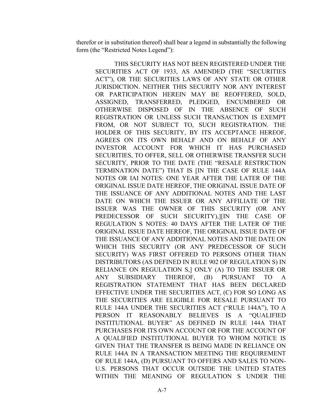 A-7 therefor or in substitution thereof) shall bear a legend in substantially the following form (the “Restricted Notes Legend”): THIS SECURITY HAS NOT BEEN REGISTERED UNDER THE SECURITIES ACT OF 1933, AS AMENDED (THE “SECURITIES ACT”), OR THE SECURITIES LAWS OF ANY STATE OR OTHER JURISDICTION. NEITHER THIS SECURITY NOR ANY INTEREST OR PARTICIPATION HEREIN MAY BE REOFFERED, SOLD, ASSIGNED, TRANSFERRED, PLEDGED, ENCUMBERED OR OTHERWISE DISPOSED OF IN THE ABSENCE OF SUCH REGISTRATION OR UNLESS SUCH TRANSACTION IS EXEMPT FROM, OR NOT SUBJECT TO, SUCH REGISTRATION. THE HOLDER OF THIS SECURITY, BY ITS ACCEPTANCE HEREOF, AGREES ON ITS OWN BEHALF AND ON BEHALF OF ANY INVESTOR ACCOUNT FOR WHICH IT HAS PURCHASED SECURITIES, TO OFFER, SELL OR OTHERWISE TRANSFER SUCH SECURITY, PRIOR TO THE DATE (THE “RESALE RESTRICTION TERMINATION DATE”) THAT IS [IN THE CASE OF RULE 144A NOTES OR IAI NOTES: ONE YEAR AFTER THE LATER OF THE ORIGINAL ISSUE DATE HEREOF, THE ORIGINAL ISSUE DATE OF THE ISSUANCE OF ANY ADDITIONAL NOTES AND THE LAST DATE ON WHICH THE ISSUER OR ANY AFFILIATE OF THE ISSUER WAS THE OWNER OF THIS SECURITY (OR ANY PREDECESSOR OF SUCH SECURITY),][IN THE CASE OF REGULATION S NOTES: 40 DAYS AFTER THE LATER OF THE ORIGINAL ISSUE DATE HEREOF, THE ORIGINAL ISSUE DATE OF THE ISSUANCE OF ANY ADDITIONAL NOTES AND THE DATE ON WHICH THIS SECURITY (OR ANY PREDECESSOR OF SUCH SECURITY) WAS FIRST OFFERED TO PERSONS OTHER THAN DISTRIBUTORS (AS DEFINED IN RULE 902 OF REGULATION S) IN RELIANCE ON REGULATION S,] ONLY (A) TO THE ISSUER OR ANY SUBSIDIARY THEREOF, (B) PURSUANT TO A REGISTRATION STATEMENT THAT HAS BEEN DECLARED EFFECTIVE UNDER THE SECURITIES ACT, (C) FOR SO LONG AS THE SECURITIES ARE ELIGIBLE FOR RESALE PURSUANT TO RULE 144A UNDER THE SECURITIES ACT (“RULE 144A”), TO A PERSON IT REASONABLY BELIEVES IS A “QUALIFIED INSTITUTIONAL BUYER” AS DEFINED IN RULE 144A THAT PURCHASES FOR ITS OWN ACCOUNT OR FOR THE ACCOUNT OF A QUALIFIED INSTITUTIONAL BUYER TO WHOM NOTICE IS GIVEN THAT THE TRANSFER IS BEING MADE IN RELIANCE ON RULE 144A IN A TRANSACTION MEETING THE REQUIREMENT OF RULE 144A, (D) PURSUANT TO OFFERS AND SALES TO NON- U.S. PERSONS THAT OCCUR OUTSIDE THE UNITED STATES WITHIN THE MEANING OF REGULATION S UNDER THE