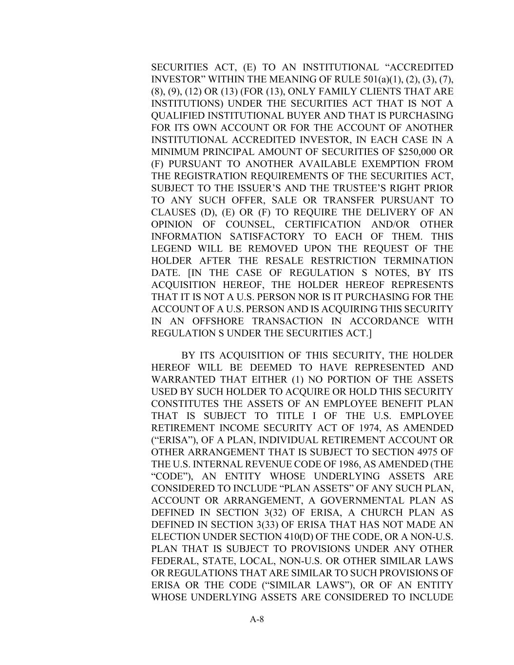A-8 SECURITIES ACT, (E) TO AN INSTITUTIONAL “ACCREDITED INVESTOR” WITHIN THE MEANING OF RULE 501(a)(1), (2), (3), (7), (8), (9), (12) OR (13) (FOR (13), ONLY FAMILY CLIENTS THAT ARE INSTITUTIONS) UNDER THE SECURITIES ACT THAT IS NOT A QUALIFIED INSTITUTIONAL BUYER AND THAT IS PURCHASING FOR ITS OWN ACCOUNT OR FOR THE ACCOUNT OF ANOTHER INSTITUTIONAL ACCREDITED INVESTOR, IN EACH CASE IN A MINIMUM PRINCIPAL AMOUNT OF SECURITIES OF $250,000 OR (F) PURSUANT TO ANOTHER AVAILABLE EXEMPTION FROM THE REGISTRATION REQUIREMENTS OF THE SECURITIES ACT, SUBJECT TO THE ISSUER’S AND THE TRUSTEE’S RIGHT PRIOR TO ANY SUCH OFFER, SALE OR TRANSFER PURSUANT TO CLAUSES (D), (E) OR (F) TO REQUIRE THE DELIVERY OF AN OPINION OF COUNSEL, CERTIFICATION AND/OR OTHER INFORMATION SATISFACTORY TO EACH OF THEM. THIS LEGEND WILL BE REMOVED UPON THE REQUEST OF THE HOLDER AFTER THE RESALE RESTRICTION TERMINATION DATE. [IN THE CASE OF REGULATION S NOTES, BY ITS ACQUISITION HEREOF, THE HOLDER HEREOF REPRESENTS THAT IT IS NOT A U.S. PERSON NOR IS IT PURCHASING FOR THE ACCOUNT OF A U.S. PERSON AND IS ACQUIRING THIS SECURITY IN AN OFFSHORE TRANSACTION IN ACCORDANCE WITH REGULATION S UNDER THE SECURITIES ACT.] BY ITS ACQUISITION OF THIS SECURITY, THE HOLDER HEREOF WILL BE DEEMED TO HAVE REPRESENTED AND WARRANTED THAT EITHER (1) NO PORTION OF THE ASSETS USED BY SUCH HOLDER TO ACQUIRE OR HOLD THIS SECURITY CONSTITUTES THE ASSETS OF AN EMPLOYEE BENEFIT PLAN THAT IS SUBJECT TO TITLE I OF THE U.S. EMPLOYEE RETIREMENT INCOME SECURITY ACT OF 1974, AS AMENDED (“ERISA”), OF A PLAN, INDIVIDUAL RETIREMENT ACCOUNT OR OTHER ARRANGEMENT THAT IS SUBJECT TO SECTION 4975 OF THE U.S. INTERNAL REVENUE CODE OF 1986, AS AMENDED (THE “CODE”), AN ENTITY WHOSE UNDERLYING ASSETS ARE CONSIDERED TO INCLUDE “PLAN ASSETS” OF ANY SUCH PLAN, ACCOUNT OR ARRANGEMENT, A GOVERNMENTAL PLAN AS DEFINED IN SECTION 3(32) OF ERISA, A CHURCH PLAN AS DEFINED IN SECTION 3(33) OF ERISA THAT HAS NOT MADE AN ELECTION UNDER SECTION 410(D) OF THE CODE, OR A NON-U.S. PLAN THAT IS SUBJECT TO PROVISIONS UNDER ANY OTHER FEDERAL, STATE, LOCAL, NON-U.S. OR OTHER SIMILAR LAWS OR REGULATIONS THAT ARE SIMILAR TO SUCH PROVISIONS OF ERISA OR THE CODE (“SIMILAR LAWS”), OR OF AN ENTITY WHOSE UNDERLYING ASSETS ARE CONSIDERED TO INCLUDE