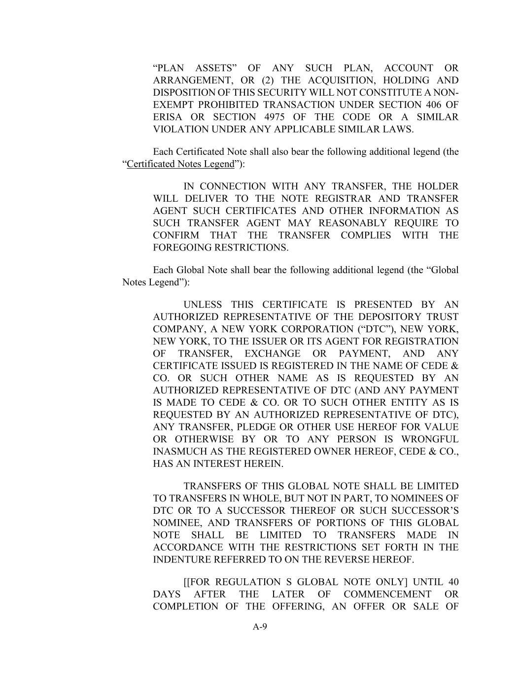 A-9 “PLAN ASSETS” OF ANY SUCH PLAN, ACCOUNT OR ARRANGEMENT, OR (2) THE ACQUISITION, HOLDING AND DISPOSITION OF THIS SECURITY WILL NOT CONSTITUTE A NON- EXEMPT PROHIBITED TRANSACTION UNDER SECTION 406 OF ERISA OR SECTION 4975 OF THE CODE OR A SIMILAR VIOLATION UNDER ANY APPLICABLE SIMILAR LAWS. Each Certificated Note shall also bear the following additional legend (the “Certificated Notes Legend”): IN CONNECTION WITH ANY TRANSFER, THE HOLDER WILL DELIVER TO THE NOTE REGISTRAR AND TRANSFER AGENT SUCH CERTIFICATES AND OTHER INFORMATION AS SUCH TRANSFER AGENT MAY REASONABLY REQUIRE TO CONFIRM THAT THE TRANSFER COMPLIES WITH THE FOREGOING RESTRICTIONS. Each Global Note shall bear the following additional legend (the “Global Notes Legend”): UNLESS THIS CERTIFICATE IS PRESENTED BY AN AUTHORIZED REPRESENTATIVE OF THE DEPOSITORY TRUST COMPANY, A NEW YORK CORPORATION (“DTC”), NEW YORK, NEW YORK, TO THE ISSUER OR ITS AGENT FOR REGISTRATION OF TRANSFER, EXCHANGE OR PAYMENT, AND ANY CERTIFICATE ISSUED IS REGISTERED IN THE NAME OF CEDE & CO. OR SUCH OTHER NAME AS IS REQUESTED BY AN AUTHORIZED REPRESENTATIVE OF DTC (AND ANY PAYMENT IS MADE TO CEDE & CO. OR TO SUCH OTHER ENTITY AS IS REQUESTED BY AN AUTHORIZED REPRESENTATIVE OF DTC), ANY TRANSFER, PLEDGE OR OTHER USE HEREOF FOR VALUE OR OTHERWISE BY OR TO ANY PERSON IS WRONGFUL INASMUCH AS THE REGISTERED OWNER HEREOF, CEDE & CO., HAS AN INTEREST HEREIN. TRANSFERS OF THIS GLOBAL NOTE SHALL BE LIMITED TO TRANSFERS IN WHOLE, BUT NOT IN PART, TO NOMINEES OF DTC OR TO A SUCCESSOR THEREOF OR SUCH SUCCESSOR’S NOMINEE, AND TRANSFERS OF PORTIONS OF THIS GLOBAL NOTE SHALL BE LIMITED TO TRANSFERS MADE IN ACCORDANCE WITH THE RESTRICTIONS SET FORTH IN THE INDENTURE REFERRED TO ON THE REVERSE HEREOF. [[FOR REGULATION S GLOBAL NOTE ONLY] UNTIL 40 DAYS AFTER THE LATER OF COMMENCEMENT OR COMPLETION OF THE OFFERING, AN OFFER OR SALE OF