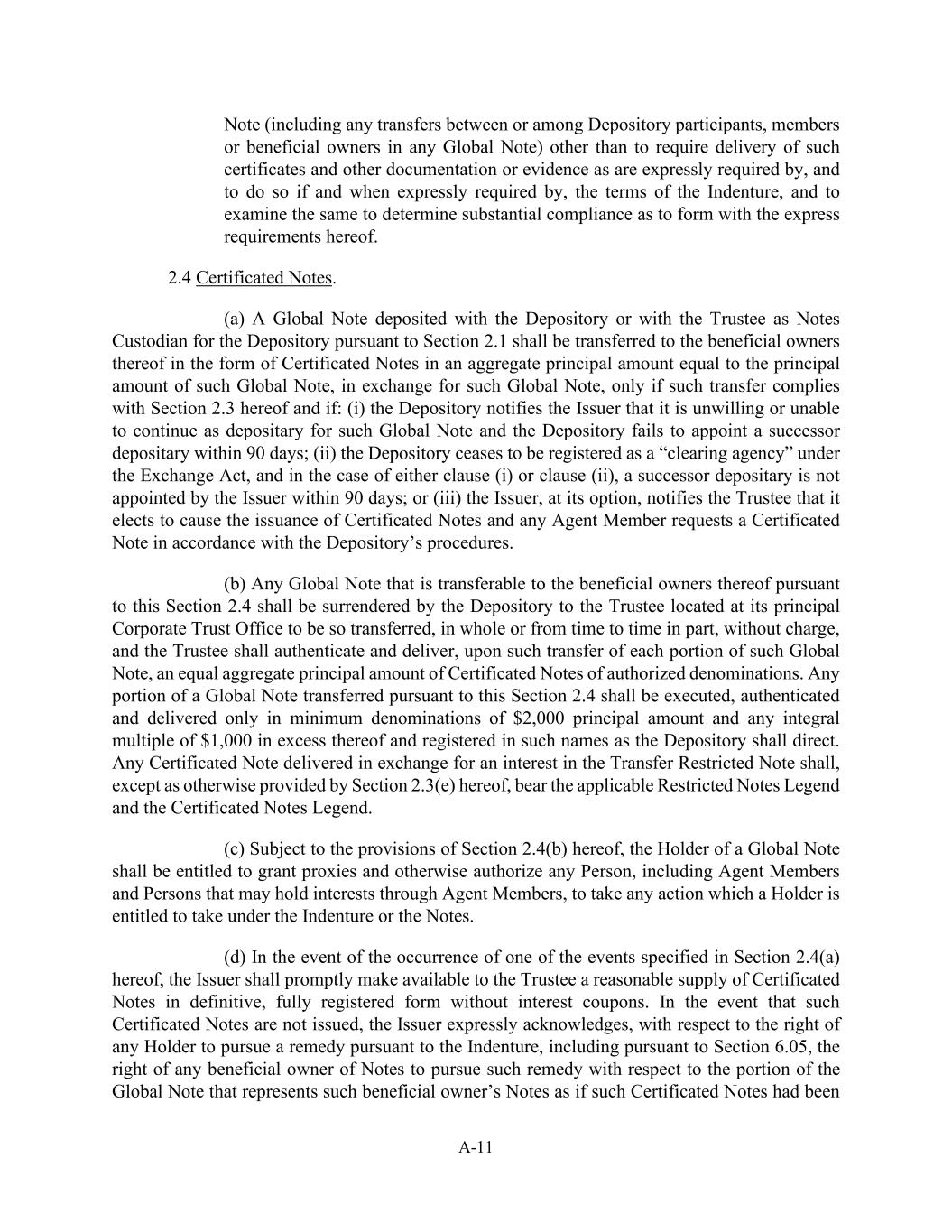 A-11 Note (including any transfers between or among Depository participants, members or beneficial owners in any Global Note) other than to require delivery of such certificates and other documentation or evidence as are expressly required by, and to do so if and when expressly required by, the terms of the Indenture, and to examine the same to determine substantial compliance as to form with the express requirements hereof. 2.4 Certificated Notes. (a) A Global Note deposited with the Depository or with the Trustee as Notes Custodian for the Depository pursuant to Section 2.1 shall be transferred to the beneficial owners thereof in the form of Certificated Notes in an aggregate principal amount equal to the principal amount of such Global Note, in exchange for such Global Note, only if such transfer complies with Section 2.3 hereof and if: (i) the Depository notifies the Issuer that it is unwilling or unable to continue as depositary for such Global Note and the Depository fails to appoint a successor depositary within 90 days; (ii) the Depository ceases to be registered as a “clearing agency” under the Exchange Act, and in the case of either clause (i) or clause (ii), a successor depositary is not appointed by the Issuer within 90 days; or (iii) the Issuer, at its option, notifies the Trustee that it elects to cause the issuance of Certificated Notes and any Agent Member requests a Certificated Note in accordance with the Depository’s procedures. (b) Any Global Note that is transferable to the beneficial owners thereof pursuant to this Section 2.4 shall be surrendered by the Depository to the Trustee located at its principal Corporate Trust Office to be so transferred, in whole or from time to time in part, without charge, and the Trustee shall authenticate and deliver, upon such transfer of each portion of such Global Note, an equal aggregate principal amount of Certificated Notes of authorized denominations. Any portion of a Global Note transferred pursuant to this Section 2.4 shall be executed, authenticated and delivered only in minimum denominations of $2,000 principal amount and any integral multiple of $1,000 in excess thereof and registered in such names as the Depository shall direct. Any Certificated Note delivered in exchange for an interest in the Transfer Restricted Note shall, except as otherwise provided by Section 2.3(e) hereof, bear the applicable Restricted Notes Legend and the Certificated Notes Legend. (c) Subject to the provisions of Section 2.4(b) hereof, the Holder of a Global Note shall be entitled to grant proxies and otherwise authorize any Person, including Agent Members and Persons that may hold interests through Agent Members, to take any action which a Holder is entitled to take under the Indenture or the Notes. (d) In the event of the occurrence of one of the events specified in Section 2.4(a) hereof, the Issuer shall promptly make available to the Trustee a reasonable supply of Certificated Notes in definitive, fully registered form without interest coupons. In the event that such Certificated Notes are not issued, the Issuer expressly acknowledges, with respect to the right of any Holder to pursue a remedy pursuant to the Indenture, including pursuant to Section 6.05, the right of any beneficial owner of Notes to pursue such remedy with respect to the portion of the Global Note that represents such beneficial owner’s Notes as if such Certificated Notes had been