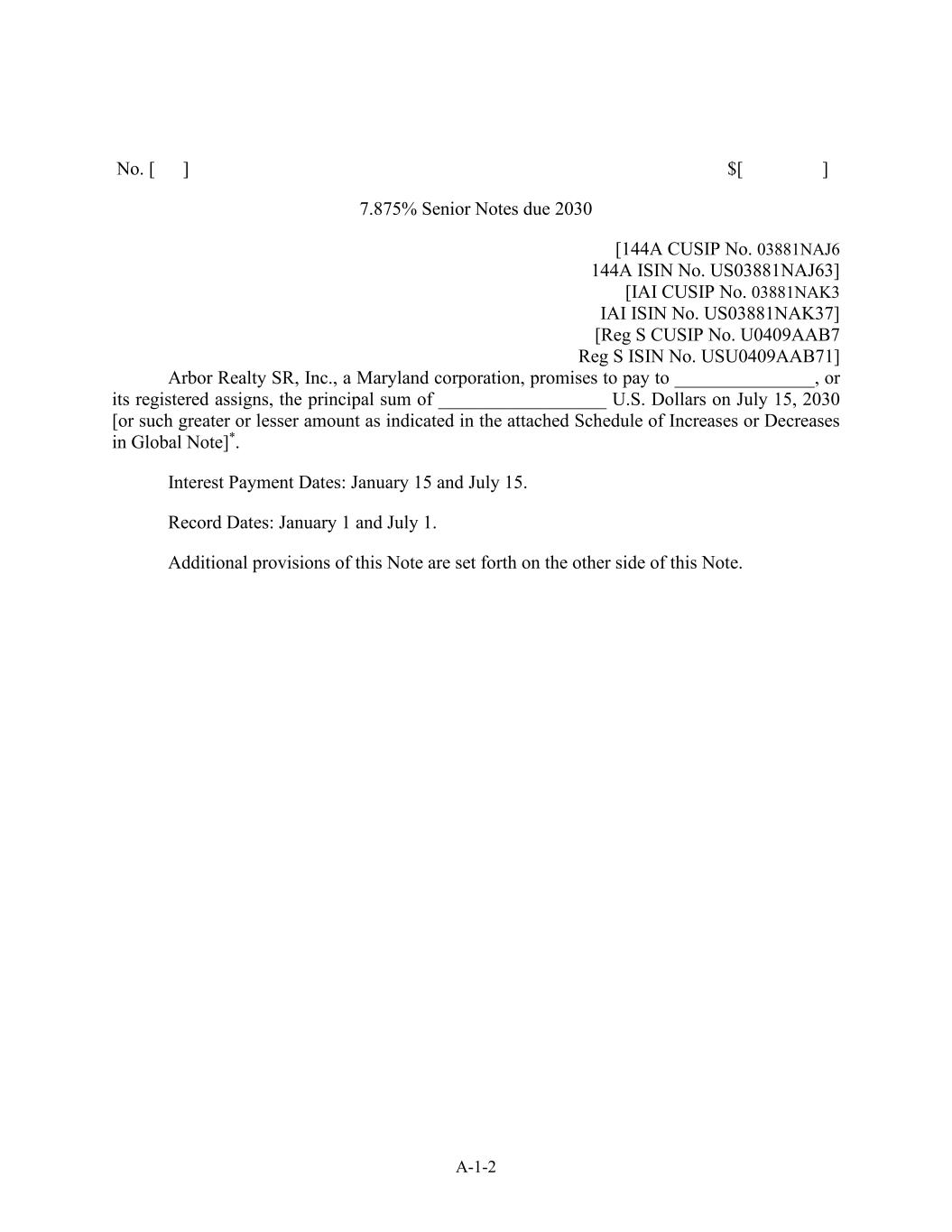 A-1-2 No. [ ] $[ ] 7.875% Senior Notes due 2030 [144A CUSIP No. 03881NAJ6 144A ISIN No. US03881NAJ63] [IAI CUSIP No. 03881NAK3 IAI ISIN No. US03881NAK37] [Reg S CUSIP No. U0409AAB7 Reg S ISIN No. USU0409AAB71] Arbor Realty SR, Inc., a Maryland corporation, promises to pay to _______________, or its registered assigns, the principal sum of __________________ U.S. Dollars on July 15, 2030 [or such greater or lesser amount as indicated in the attached Schedule of Increases or Decreases in Global Note]*. Interest Payment Dates: January 15 and July 15. Record Dates: January 1 and July 1. Additional provisions of this Note are set forth on the other side of this Note.