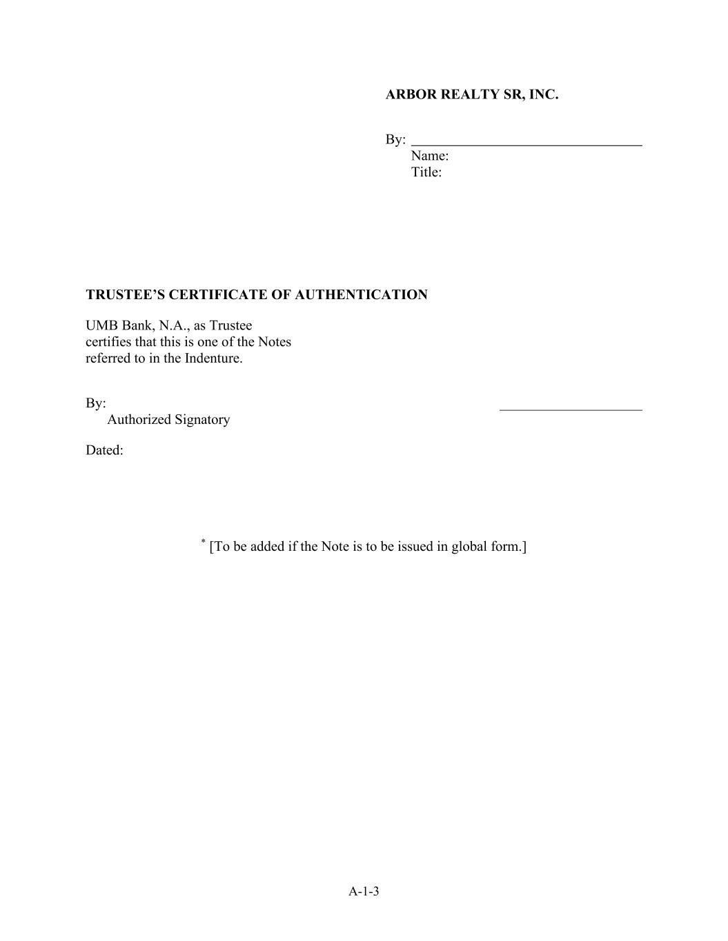 A-1-3 ARBOR REALTY SR, INC. By: Name: Title: TRUSTEE’S CERTIFICATE OF AUTHENTICATION UMB Bank, N.A., as Trustee certifies that this is one of the Notes referred to in the Indenture. By: ____________________ Authorized Signatory Dated: * [To be added if the Note is to be issued in global form.]