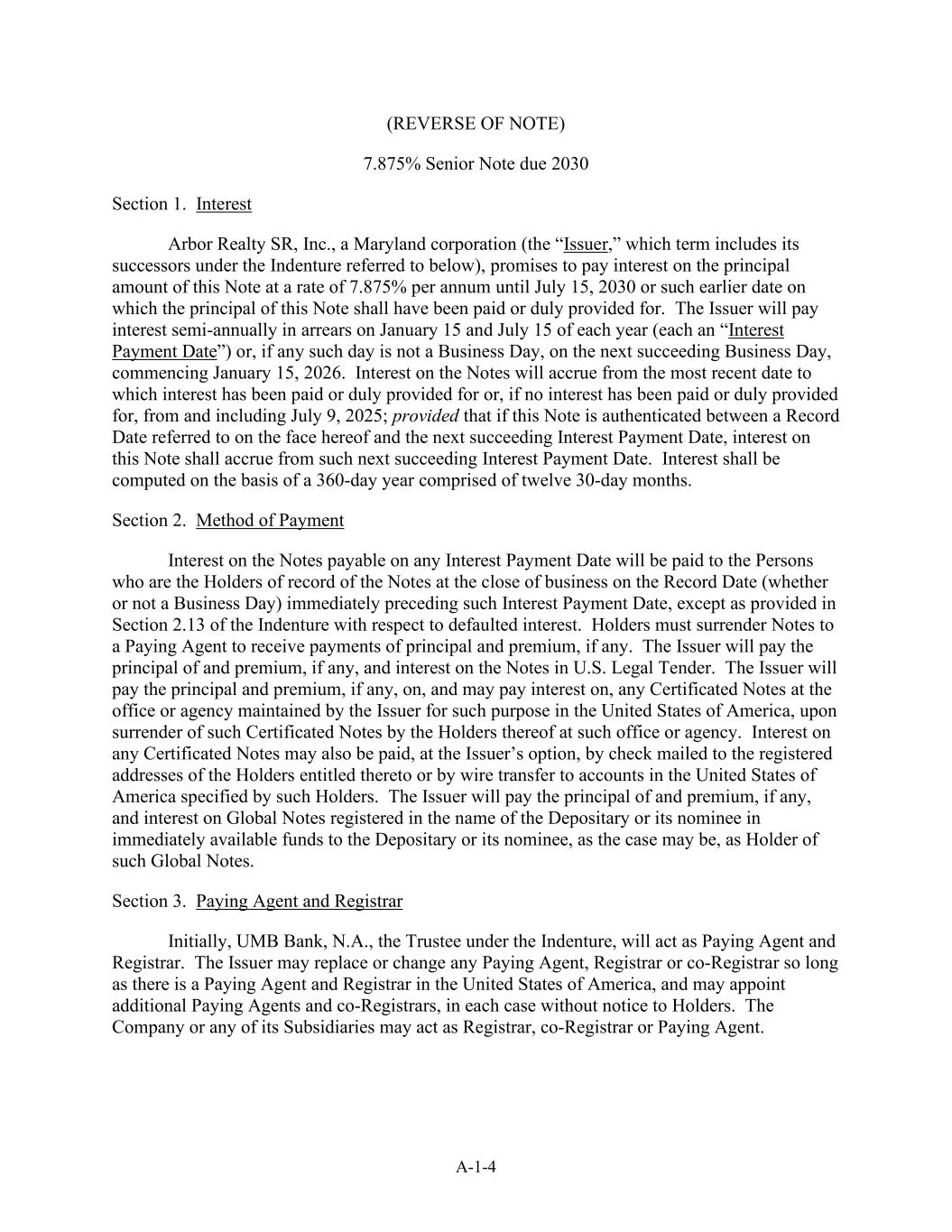 A-1-4 (REVERSE OF NOTE) 7.875% Senior Note due 2030 Section 1. Interest Arbor Realty SR, Inc., a Maryland corporation (the “Issuer,” which term includes its successors under the Indenture referred to below), promises to pay interest on the principal amount of this Note at a rate of 7.875% per annum until July 15, 2030 or such earlier date on which the principal of this Note shall have been paid or duly provided for. The Issuer will pay interest semi-annually in arrears on January 15 and July 15 of each year (each an “Interest Payment Date”) or, if any such day is not a Business Day, on the next succeeding Business Day, commencing January 15, 2026. Interest on the Notes will accrue from the most recent date to which interest has been paid or duly provided for or, if no interest has been paid or duly provided for, from and including July 9, 2025; provided that if this Note is authenticated between a Record Date referred to on the face hereof and the next succeeding Interest Payment Date, interest on this Note shall accrue from such next succeeding Interest Payment Date. Interest shall be computed on the basis of a 360-day year comprised of twelve 30-day months. Section 2. Method of Payment Interest on the Notes payable on any Interest Payment Date will be paid to the Persons who are the Holders of record of the Notes at the close of business on the Record Date (whether or not a Business Day) immediately preceding such Interest Payment Date, except as provided in Section 2.13 of the Indenture with respect to defaulted interest. Holders must surrender Notes to a Paying Agent to receive payments of principal and premium, if any. The Issuer will pay the principal of and premium, if any, and interest on the Notes in U.S. Legal Tender. The Issuer will pay the principal and premium, if any, on, and may pay interest on, any Certificated Notes at the office or agency maintained by the Issuer for such purpose in the United States of America, upon surrender of such Certificated Notes by the Holders thereof at such office or agency. Interest on any Certificated Notes may also be paid, at the Issuer’s option, by check mailed to the registered addresses of the Holders entitled thereto or by wire transfer to accounts in the United States of America specified by such Holders. The Issuer will pay the principal of and premium, if any, and interest on Global Notes registered in the name of the Depositary or its nominee in immediately available funds to the Depositary or its nominee, as the case may be, as Holder of such Global Notes. Section 3. Paying Agent and Registrar Initially, UMB Bank, N.A., the Trustee under the Indenture, will act as Paying Agent and Registrar. The Issuer may replace or change any Paying Agent, Registrar or co-Registrar so long as there is a Paying Agent and Registrar in the United States of America, and may appoint additional Paying Agents and co-Registrars, in each case without notice to Holders. The Company or any of its Subsidiaries may act as Registrar, co-Registrar or Paying Agent.