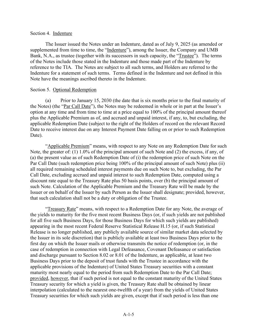 A-1-5 Section 4. Indenture The Issuer issued the Notes under an Indenture, dated as of July 9, 2025 (as amended or supplemented from time to time, the “Indenture”), among the Issuer, the Company and UMB Bank, N.A., as trustee (together with its successors in such capacity, the “Trustee”). The terms of the Notes include those stated in the Indenture and those made part of the Indenture by reference to the TIA. The Notes are subject to all such terms, and Holders are referred to the Indenture for a statement of such terms. Terms defined in the Indenture and not defined in this Note have the meanings ascribed thereto in the Indenture. Section 5. Optional Redemption (a) Prior to January 15, 2030 (the date that is six months prior to the final maturity of the Notes) (the “Par Call Date”), the Notes may be redeemed in whole or in part at the Issuer’s option at any time and from time to time at a price equal to 100% of the principal amount thereof plus the Applicable Premium as of, and accrued and unpaid interest, if any, to, but excluding, the applicable Redemption Date (subject to the right of the Holders of record on the relevant Record Date to receive interest due on any Interest Payment Date falling on or prior to such Redemption Date). “Applicable Premium” means, with respect to any Note on any Redemption Date for such Note, the greater of: (1) 1.0% of the principal amount of such Note and (2) the excess, if any, of (a) the present value as of such Redemption Date of (i) the redemption price of such Note on the Par Call Date (such redemption price being 100% of the principal amount of such Note) plus (ii) all required remaining scheduled interest payments due on such Note to, but excluding, the Par Call Date, excluding accrued and unpaid interest to such Redemption Date, computed using a discount rate equal to the Treasury Rate plus 50 basis points, over (b) the principal amount of such Note. Calculation of the Applicable Premium and the Treasury Rate will be made by the Issuer or on behalf of the Issuer by such Person as the Issuer shall designate; provided, however, that such calculation shall not be a duty or obligation of the Trustee. “Treasury Rate” means, with respect to a Redemption Date for any Note, the average of the yields to maturity for the five most recent Business Days (or, if such yields are not published for all five such Business Days, for those Business Days for which such yields are published) appearing in the most recent Federal Reserve Statistical Release H.15 (or, if such Statistical Release is no longer published, any publicly available source of similar market data selected by the Issuer in its sole discretion) that is publicly available at least two Business Days prior to the first day on which the Issuer mails or otherwise transmits the notice of redemption (or, in the case of redemption in connection with Legal Defeasance, Covenant Defeasance or satisfaction and discharge pursuant to Section 8.02 or 8.01 of the Indenture, as applicable, at least two Business Days prior to the deposit of trust funds with the Trustee in accordance with the applicable provisions of the Indenture) of United States Treasury securities with a constant maturity most nearly equal to the period from such Redemption Date to the Par Call Date; provided, however, that if such period is not equal to the constant maturity of the United States Treasury security for which a yield is given, the Treasury Rate shall be obtained by linear interpolation (calculated to the nearest one-twelfth of a year) from the yields of United States Treasury securities for which such yields are given, except that if such period is less than one