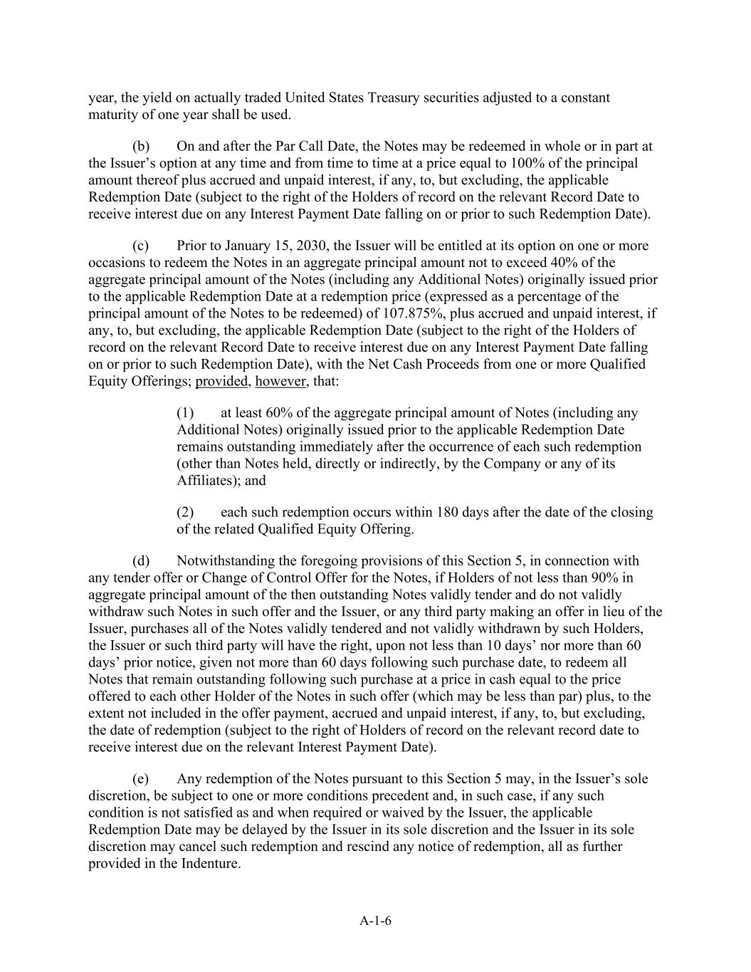 A-1-6 year, the yield on actually traded United States Treasury securities adjusted to a constant maturity of one year shall be used. (b) On and after the Par Call Date, the Notes may be redeemed in whole or in part at the Issuer’s option at any time and from time to time at a price equal to 100% of the principal amount thereof plus accrued and unpaid interest, if any, to, but excluding, the applicable Redemption Date (subject to the right of the Holders of record on the relevant Record Date to receive interest due on any Interest Payment Date falling on or prior to such Redemption Date). (c) Prior to January 15, 2030, the Issuer will be entitled at its option on one or more occasions to redeem the Notes in an aggregate principal amount not to exceed 40% of the aggregate principal amount of the Notes (including any Additional Notes) originally issued prior to the applicable Redemption Date at a redemption price (expressed as a percentage of the principal amount of the Notes to be redeemed) of 107.875%, plus accrued and unpaid interest, if any, to, but excluding, the applicable Redemption Date (subject to the right of the Holders of record on the relevant Record Date to receive interest due on any Interest Payment Date falling on or prior to such Redemption Date), with the Net Cash Proceeds from one or more Qualified Equity Offerings; provided, however, that: (1) at least 60% of the aggregate principal amount of Notes (including any Additional Notes) originally issued prior to the applicable Redemption Date remains outstanding immediately after the occurrence of each such redemption (other than Notes held, directly or indirectly, by the Company or any of its Affiliates); and (2) each such redemption occurs within 180 days after the date of the closing of the related Qualified Equity Offering. (d) Notwithstanding the foregoing provisions of this Section 5, in connection with any tender offer or Change of Control Offer for the Notes, if Holders of not less than 90% in aggregate principal amount of the then outstanding Notes validly tender and do not validly withdraw such Notes in such offer and the Issuer, or any third party making an offer in lieu of the Issuer, purchases all of the Notes validly tendered and not validly withdrawn by such Holders, the Issuer or such third party will have the right, upon not less than 10 days’ nor more than 60 days’ prior notice, given not more than 60 days following such purchase date, to redeem all Notes that remain outstanding following such purchase at a price in cash equal to the price offered to each other Holder of the Notes in such offer (which may be less than par) plus, to the extent not included in the offer payment, accrued and unpaid interest, if any, to, but excluding, the date of redemption (subject to the right of Holders of record on the relevant record date to receive interest due on the relevant Interest Payment Date). (e) Any redemption of the Notes pursuant to this Section 5 may, in the Issuer’s sole discretion, be subject to one or more conditions precedent and, in such case, if any such condition is not satisfied as and when required or waived by the Issuer, the applicable Redemption Date may be delayed by the Issuer in its sole discretion and the Issuer in its sole discretion may cancel such redemption and rescind any notice of redemption, all as further provided in the Indenture.