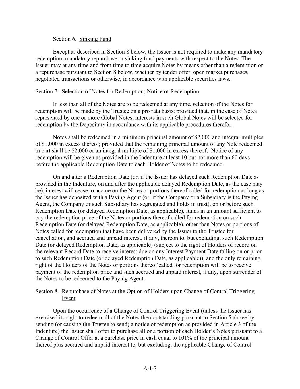 A-1-7 Section 6. Sinking Fund Except as described in Section 8 below, the Issuer is not required to make any mandatory redemption, mandatory repurchase or sinking fund payments with respect to the Notes. The Issuer may at any time and from time to time acquire Notes by means other than a redemption or a repurchase pursuant to Section 8 below, whether by tender offer, open market purchases, negotiated transactions or otherwise, in accordance with applicable securities laws. Section 7. Selection of Notes for Redemption; Notice of Redemption If less than all of the Notes are to be redeemed at any time, selection of the Notes for redemption will be made by the Trustee on a pro rata basis; provided that, in the case of Notes represented by one or more Global Notes, interests in such Global Notes will be selected for redemption by the Depositary in accordance with its applicable procedures therefor. Notes shall be redeemed in a minimum principal amount of $2,000 and integral multiples of $1,000 in excess thereof; provided that the remaining principal amount of any Note redeemed in part shall be $2,000 or an integral multiple of $1,000 in excess thereof. Notice of any redemption will be given as provided in the Indenture at least 10 but not more than 60 days before the applicable Redemption Date to each Holder of Notes to be redeemed. On and after a Redemption Date (or, if the Issuer has delayed such Redemption Date as provided in the Indenture, on and after the applicable delayed Redemption Date, as the case may be), interest will cease to accrue on the Notes or portions thereof called for redemption as long as the Issuer has deposited with a Paying Agent (or, if the Company or a Subsidiary is the Paying Agent, the Company or such Subsidiary has segregated and holds in trust), on or before such Redemption Date (or delayed Redemption Date, as applicable), funds in an amount sufficient to pay the redemption price of the Notes or portions thereof called for redemption on such Redemption Date (or delayed Redemption Date, as applicable), other than Notes or portions of Notes called for redemption that have been delivered by the Issuer to the Trustee for cancellation, and accrued and unpaid interest, if any, thereon to, but excluding, such Redemption Date (or delayed Redemption Date, as applicable) (subject to the right of Holders of record on the relevant Record Date to receive interest due on any Interest Payment Date falling on or prior to such Redemption Date (or delayed Redemption Date, as applicable)), and the only remaining right of the Holders of the Notes or portions thereof called for redemption will be to receive payment of the redemption price and such accrued and unpaid interest, if any, upon surrender of the Notes to be redeemed to the Paying Agent. Section 8. Repurchase of Notes at the Option of Holders upon Change of Control Triggering Event Upon the occurrence of a Change of Control Triggering Event (unless the Issuer has exercised its right to redeem all of the Notes then outstanding pursuant to Section 5 above by sending (or causing the Trustee to send) a notice of redemption as provided in Article 3 of the Indenture) the Issuer shall offer to purchase all or a portion of each Holder’s Notes pursuant to a Change of Control Offer at a purchase price in cash equal to 101% of the principal amount thereof plus accrued and unpaid interest to, but excluding, the applicable Change of Control