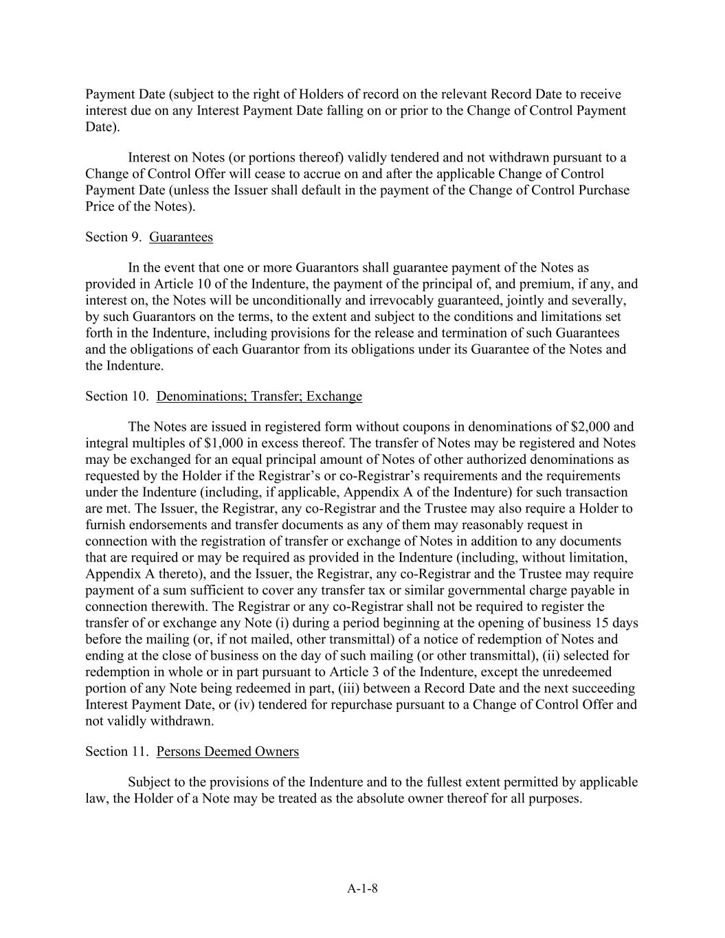 A-1-8 Payment Date (subject to the right of Holders of record on the relevant Record Date to receive interest due on any Interest Payment Date falling on or prior to the Change of Control Payment Date). Interest on Notes (or portions thereof) validly tendered and not withdrawn pursuant to a Change of Control Offer will cease to accrue on and after the applicable Change of Control Payment Date (unless the Issuer shall default in the payment of the Change of Control Purchase Price of the Notes). Section 9. Guarantees In the event that one or more Guarantors shall guarantee payment of the Notes as provided in Article 10 of the Indenture, the payment of the principal of, and premium, if any, and interest on, the Notes will be unconditionally and irrevocably guaranteed, jointly and severally, by such Guarantors on the terms, to the extent and subject to the conditions and limitations set forth in the Indenture, including provisions for the release and termination of such Guarantees and the obligations of each Guarantor from its obligations under its Guarantee of the Notes and the Indenture. Section 10. Denominations; Transfer; Exchange The Notes are issued in registered form without coupons in denominations of $2,000 and integral multiples of $1,000 in excess thereof. The transfer of Notes may be registered and Notes may be exchanged for an equal principal amount of Notes of other authorized denominations as requested by the Holder if the Registrar’s or co-Registrar’s requirements and the requirements under the Indenture (including, if applicable, Appendix A of the Indenture) for such transaction are met. The Issuer, the Registrar, any co-Registrar and the Trustee may also require a Holder to furnish endorsements and transfer documents as any of them may reasonably request in connection with the registration of transfer or exchange of Notes in addition to any documents that are required or may be required as provided in the Indenture (including, without limitation, Appendix A thereto), and the Issuer, the Registrar, any co-Registrar and the Trustee may require payment of a sum sufficient to cover any transfer tax or similar governmental charge payable in connection therewith. The Registrar or any co-Registrar shall not be required to register the transfer of or exchange any Note (i) during a period beginning at the opening of business 15 days before the mailing (or, if not mailed, other transmittal) of a notice of redemption of Notes and ending at the close of business on the day of such mailing (or other transmittal), (ii) selected for redemption in whole or in part pursuant to Article 3 of the Indenture, except the unredeemed portion of any Note being redeemed in part, (iii) between a Record Date and the next succeeding Interest Payment Date, or (iv) tendered for repurchase pursuant to a Change of Control Offer and not validly withdrawn. Section 11. Persons Deemed Owners Subject to the provisions of the Indenture and to the fullest extent permitted by applicable law, the Holder of a Note may be treated as the absolute owner thereof for all purposes.
