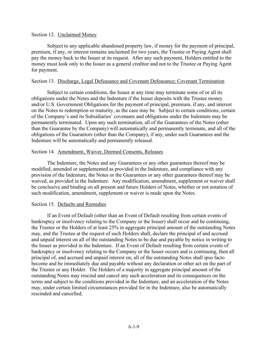 A-1-9 Section 12. Unclaimed Money Subject to any applicable abandoned property law, if money for the payment of principal, premium, if any, or interest remains unclaimed for two years, the Trustee or Paying Agent shall pay the money back to the Issuer at its request. After any such payment, Holders entitled to the money must look only to the Issuer as a general creditor and not to the Trustee or Paying Agent for payment. Section 13. Discharge, Legal Defeasance and Covenant Defeasance; Covenant Termination Subject to certain conditions, the Issuer at any time may terminate some of or all its obligations under the Notes and the Indenture if the Issuer deposits with the Trustee money and/or U.S. Government Obligations for the payment of principal, premium, if any, and interest on the Notes to redemption or maturity, as the case may be. Subject to certain conditions, certain of the Company’s and its Subsidiaries’ covenants and obligations under the Indenture may be permanently terminated. Upon any such termination, all of the Guarantees of the Notes (other than the Guarantee by the Company) will automatically and permanently terminate, and all of the obligations of the Guarantors (other than the Company), if any, under such Guarantees and the Indenture will be automatically and permanently released. Section 14. Amendment, Waiver, Deemed Consents, Releases The Indenture, the Notes and any Guarantees or any other guarantees thereof may be modified, amended or supplemented as provided in the Indenture, and compliance with any provision of the Indenture, the Notes or the Guarantees or any other guarantees thereof may be waived, as provided in the Indenture. Any modification, amendment, supplement or waiver shall be conclusive and binding on all present and future Holders of Notes, whether or not notation of such modification, amendment, supplement or waiver is made upon the Notes. Section 15. Defaults and Remedies If an Event of Default (other than an Event of Default resulting from certain events of bankruptcy or insolvency relating to the Company or the Issuer) shall occur and be continuing, the Trustee or the Holders of at least 25% in aggregate principal amount of the outstanding Notes may, and the Trustee at the request of such Holders shall, declare the principal of and accrued and unpaid interest on all of the outstanding Notes to be due and payable by notice in writing to the Issuer as provided in the Indenture. If an Event of Default resulting from certain events of bankruptcy or insolvency relating to the Company or the Issuer occurs and is continuing, then all principal of, and accrued and unpaid interest on, all of the outstanding Notes shall ipso facto become and be immediately due and payable without any declaration or other act on the part of the Trustee or any Holder. The Holders of a majority in aggregate principal amount of the outstanding Notes may rescind and cancel any such acceleration and its consequences on the terms and subject to the conditions provided in the Indenture, and an acceleration of the Notes may, under certain limited circumstances provided for in the Indenture, also be automatically rescinded and cancelled.