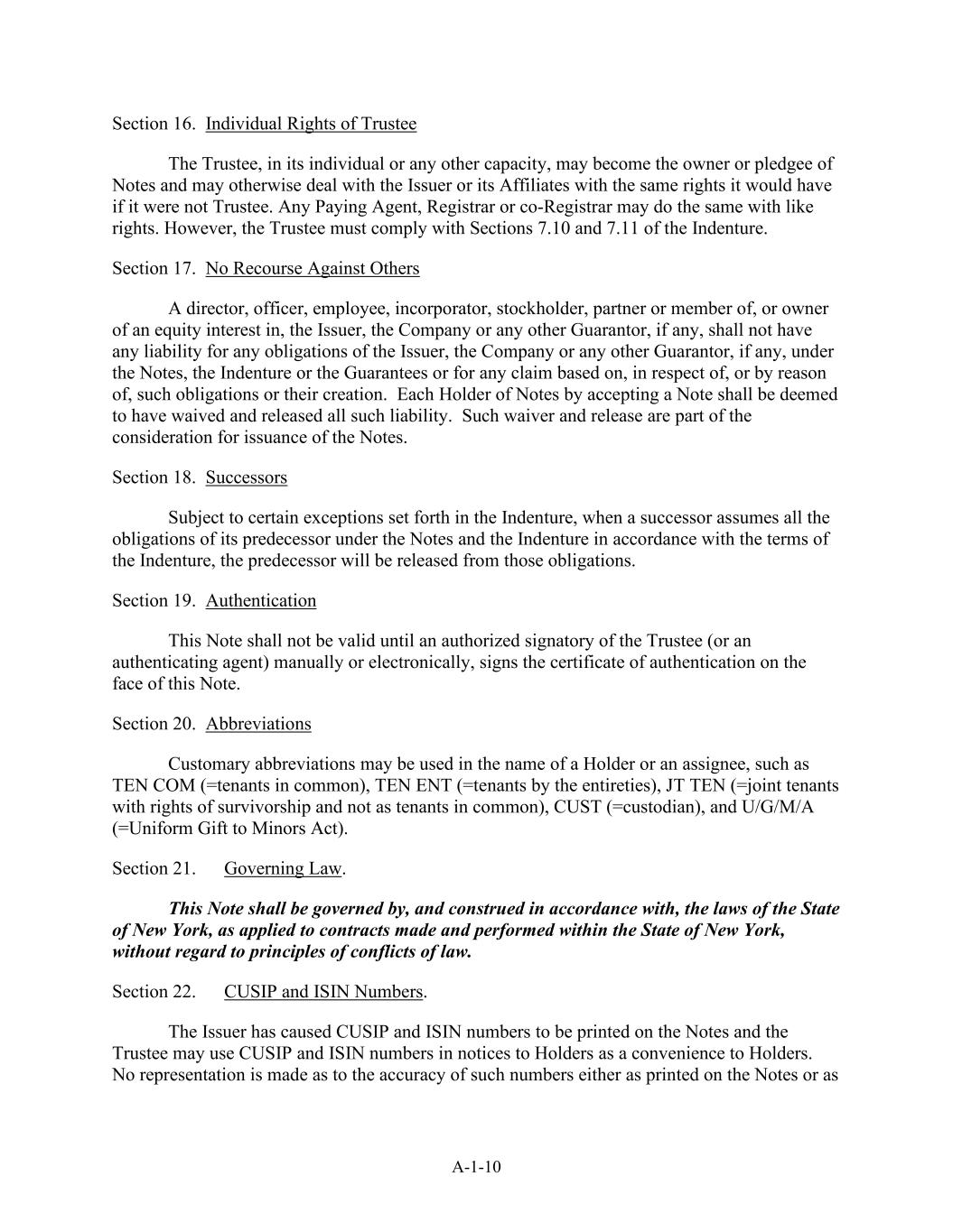 A-1-10 Section 16. Individual Rights of Trustee The Trustee, in its individual or any other capacity, may become the owner or pledgee of Notes and may otherwise deal with the Issuer or its Affiliates with the same rights it would have if it were not Trustee. Any Paying Agent, Registrar or co-Registrar may do the same with like rights. However, the Trustee must comply with Sections 7.10 and 7.11 of the Indenture. Section 17. No Recourse Against Others A director, officer, employee, incorporator, stockholder, partner or member of, or owner of an equity interest in, the Issuer, the Company or any other Guarantor, if any, shall not have any liability for any obligations of the Issuer, the Company or any other Guarantor, if any, under the Notes, the Indenture or the Guarantees or for any claim based on, in respect of, or by reason of, such obligations or their creation. Each Holder of Notes by accepting a Note shall be deemed to have waived and released all such liability. Such waiver and release are part of the consideration for issuance of the Notes. Section 18. Successors Subject to certain exceptions set forth in the Indenture, when a successor assumes all the obligations of its predecessor under the Notes and the Indenture in accordance with the terms of the Indenture, the predecessor will be released from those obligations. Section 19. Authentication This Note shall not be valid until an authorized signatory of the Trustee (or an authenticating agent) manually or electronically, signs the certificate of authentication on the face of this Note. Section 20. Abbreviations Customary abbreviations may be used in the name of a Holder or an assignee, such as TEN COM (=tenants in common), TEN ENT (=tenants by the entireties), JT TEN (=joint tenants with rights of survivorship and not as tenants in common), CUST (=custodian), and U/G/M/A (=Uniform Gift to Minors Act). Section 21. Governing Law. This Note shall be governed by, and construed in accordance with, the laws of the State of New York, as applied to contracts made and performed within the State of New York, without regard to principles of conflicts of law. Section 22. CUSIP and ISIN Numbers. The Issuer has caused CUSIP and ISIN numbers to be printed on the Notes and the Trustee may use CUSIP and ISIN numbers in notices to Holders as a convenience to Holders. No representation is made as to the accuracy of such numbers either as printed on the Notes or as