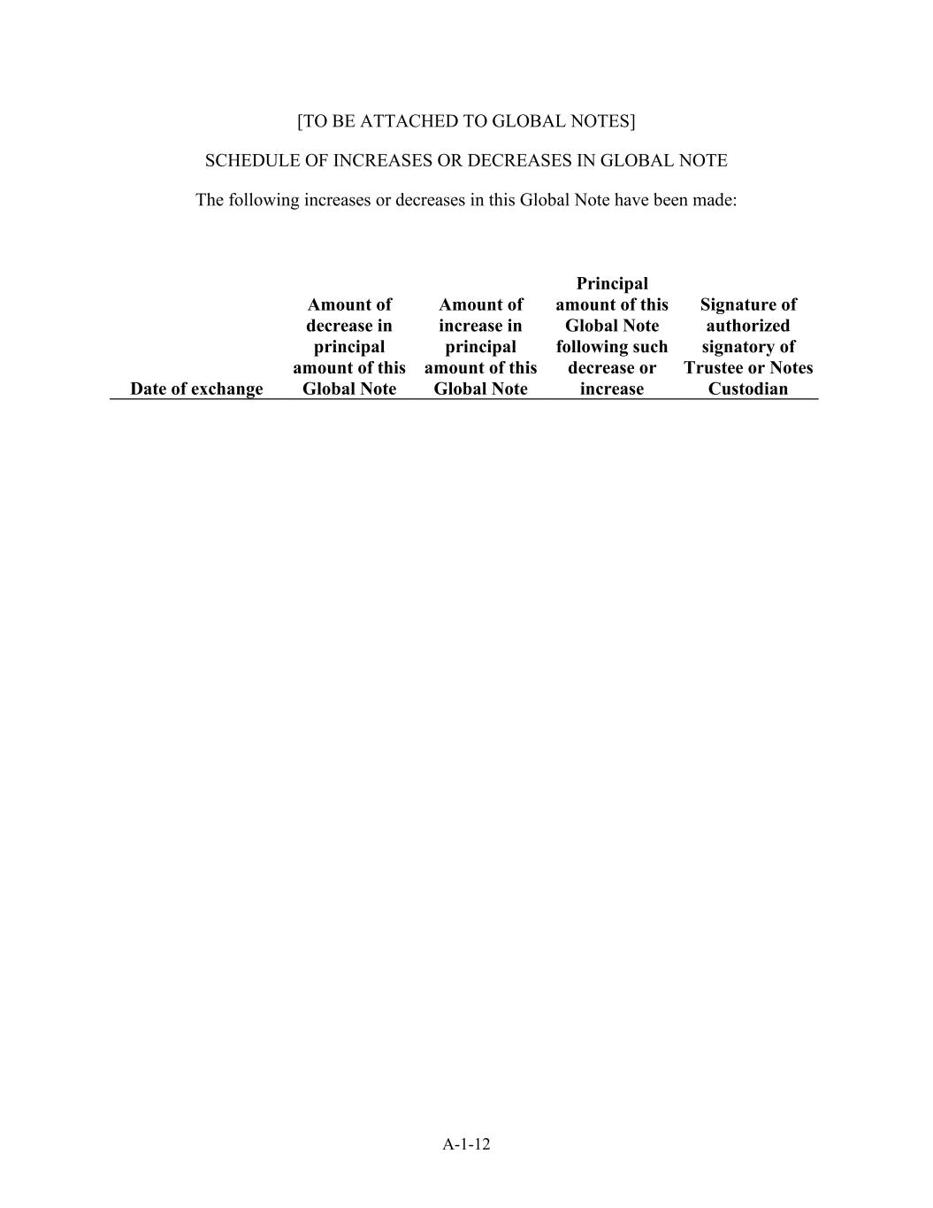 A-1-12 [TO BE ATTACHED TO GLOBAL NOTES] SCHEDULE OF INCREASES OR DECREASES IN GLOBAL NOTE The following increases or decreases in this Global Note have been made: Date of exchange Amount of decrease in principal amount of this Global Note Amount of increase in principal amount of this Global Note Principal amount of this Global Note following such decrease or increase Signature of authorized signatory of Trustee or Notes Custodian